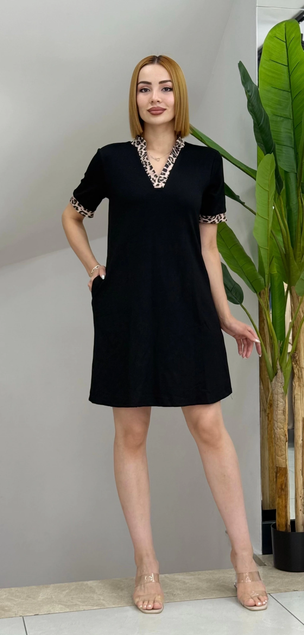 Kadın Kısa Kollu V Yakalı Leopar Desen Detaylı Modal Elbise