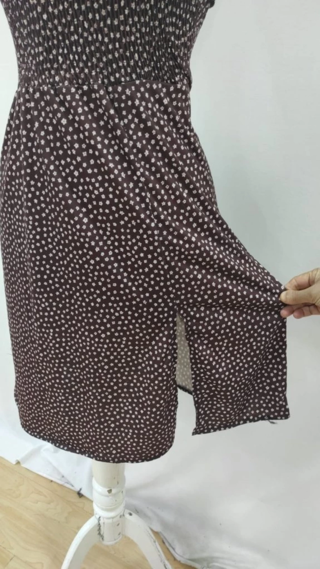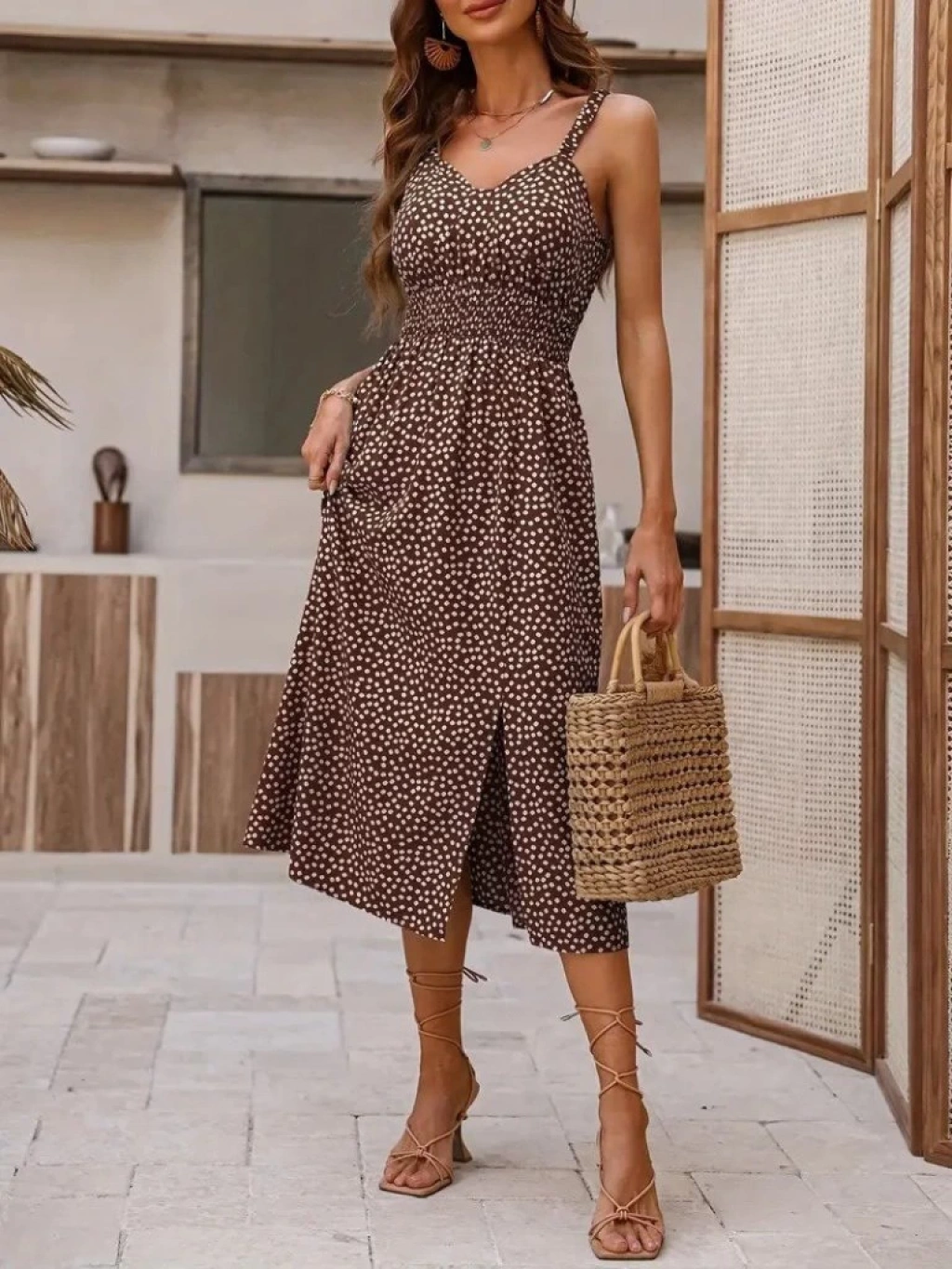 Kadın Askılı V Yakalı Beli Lastikli Yırtmaçlı Süprem Midi Elbise