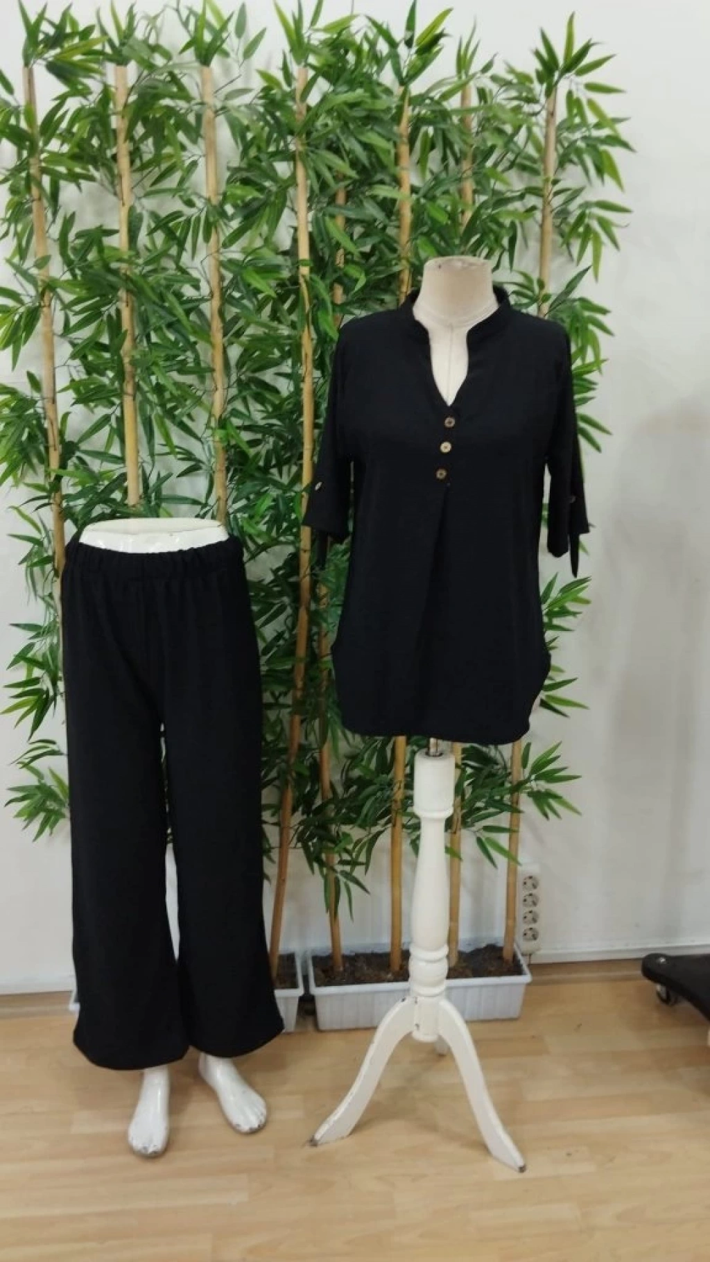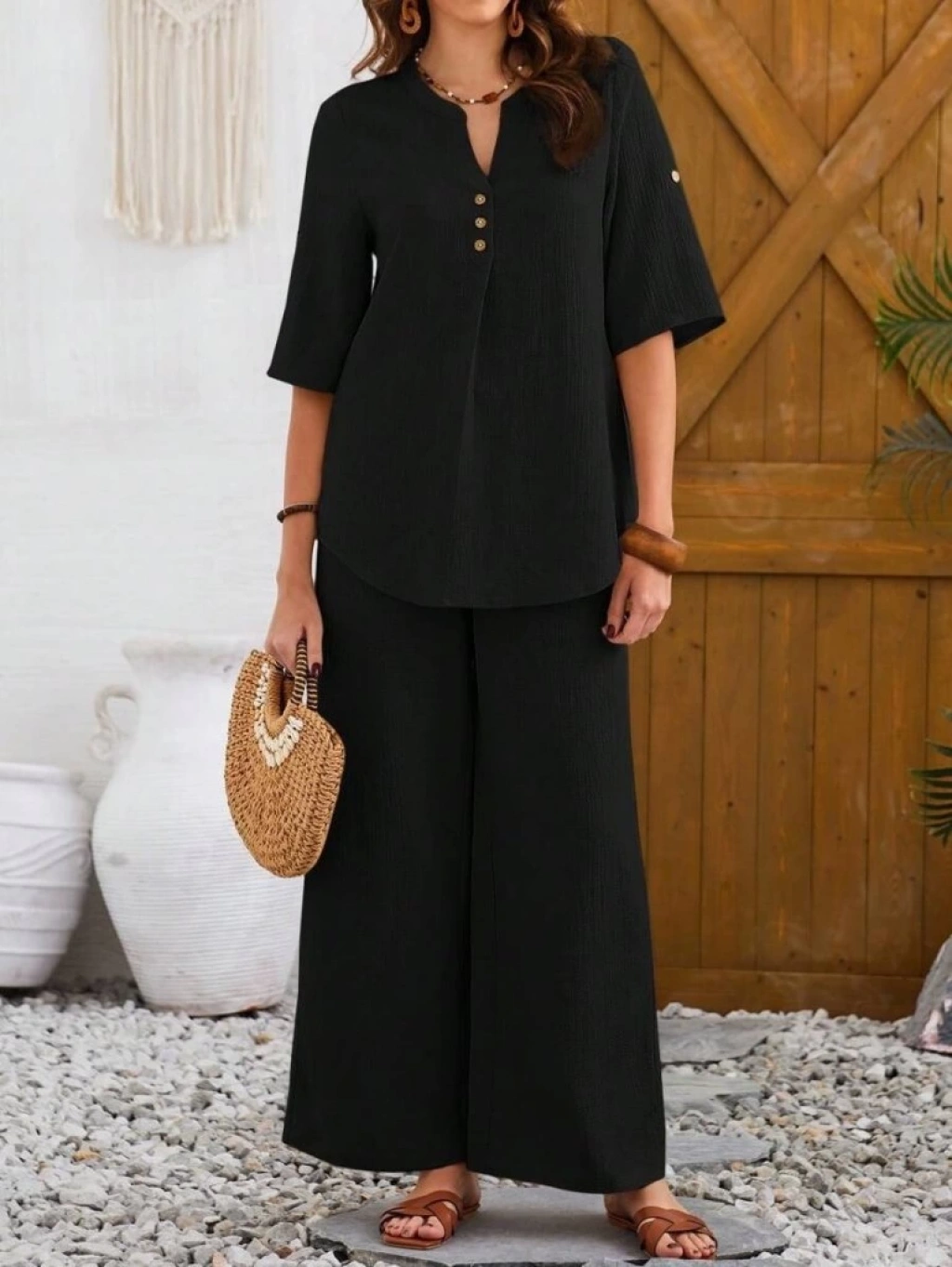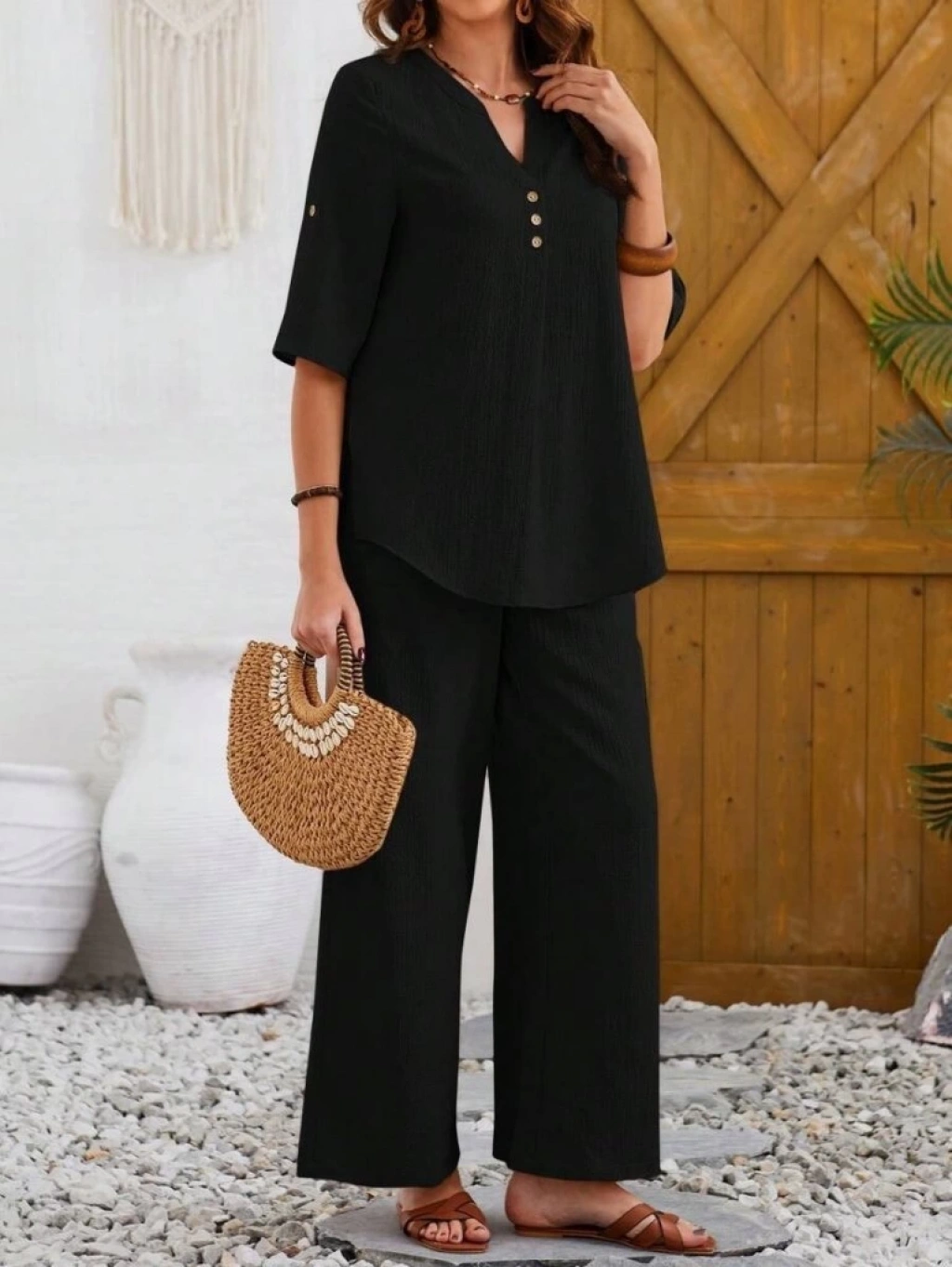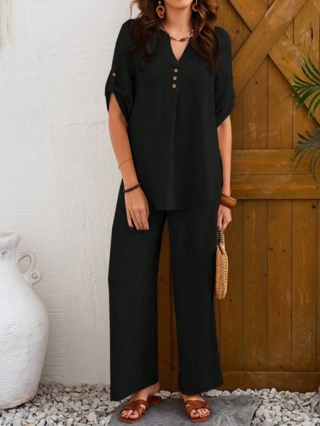 Kadın Kısa Kollu V Hakim Yaka Düğmeli Bürümcük Bluz Ve Pantolon Ikili Takım