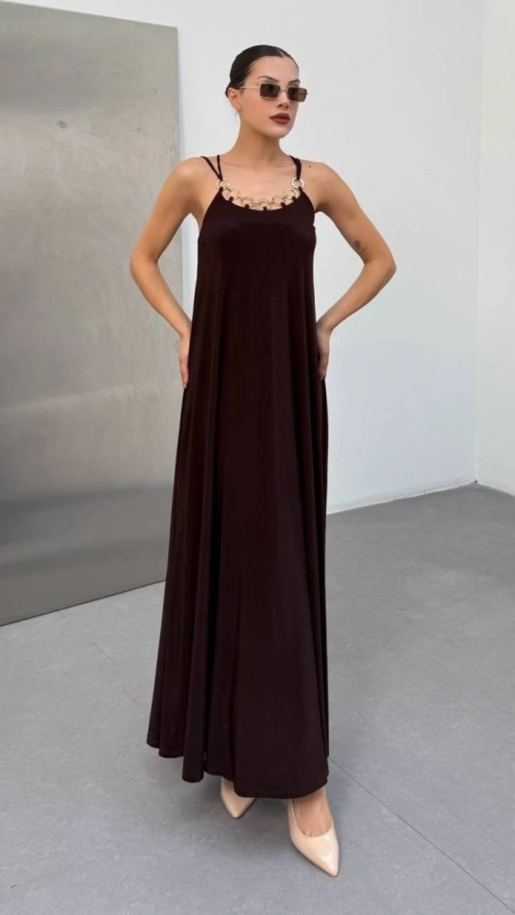 Kadın Omuz Askılı Kuş Gözü Zincir Detay Sandy Kumaş Maxi Boy Elbise