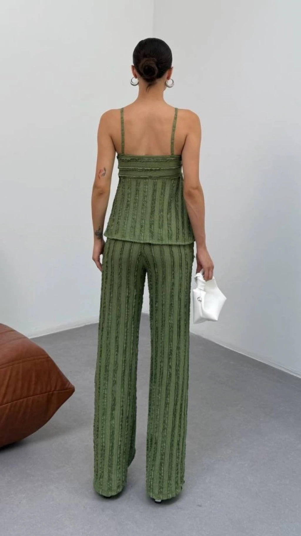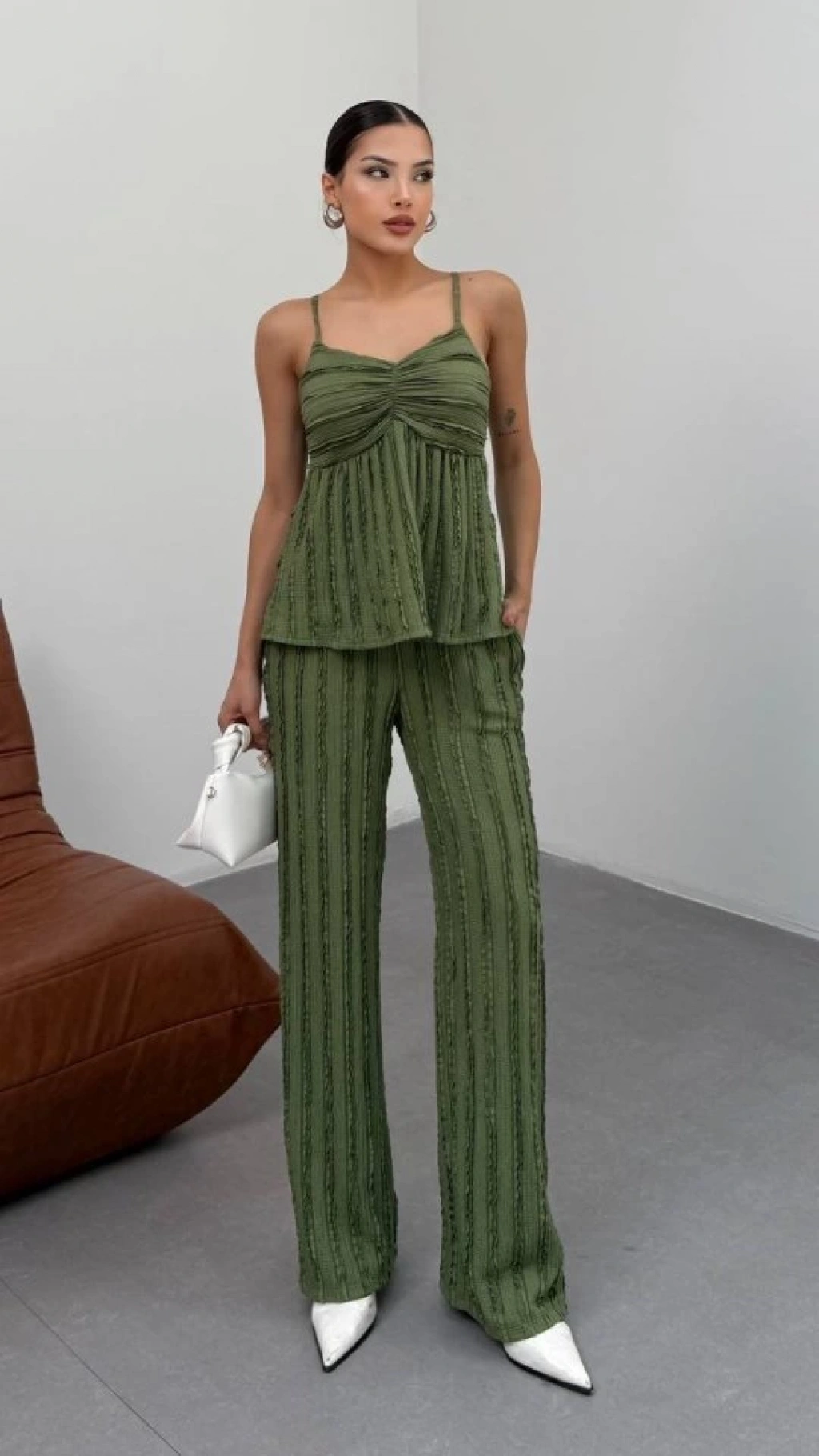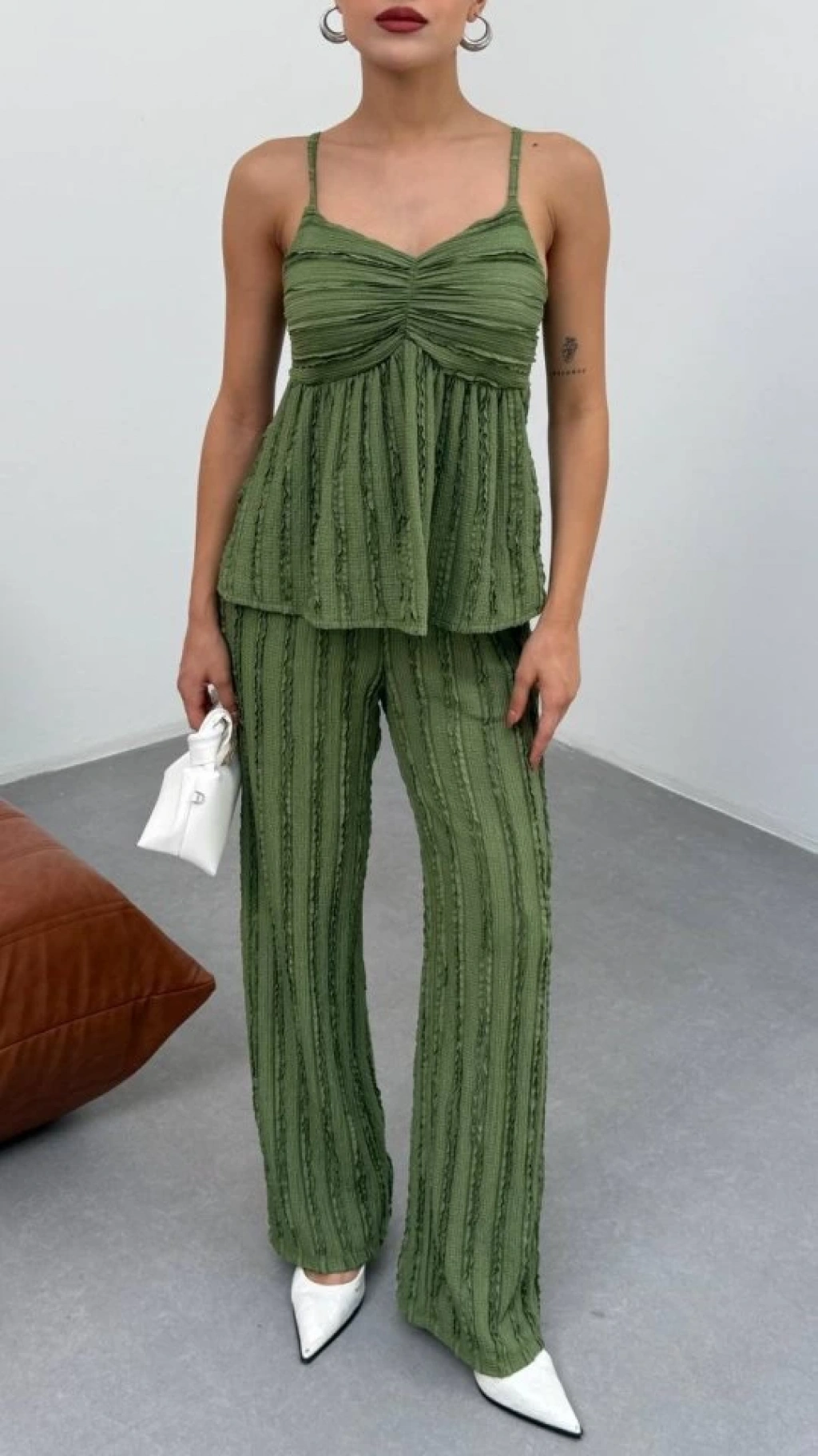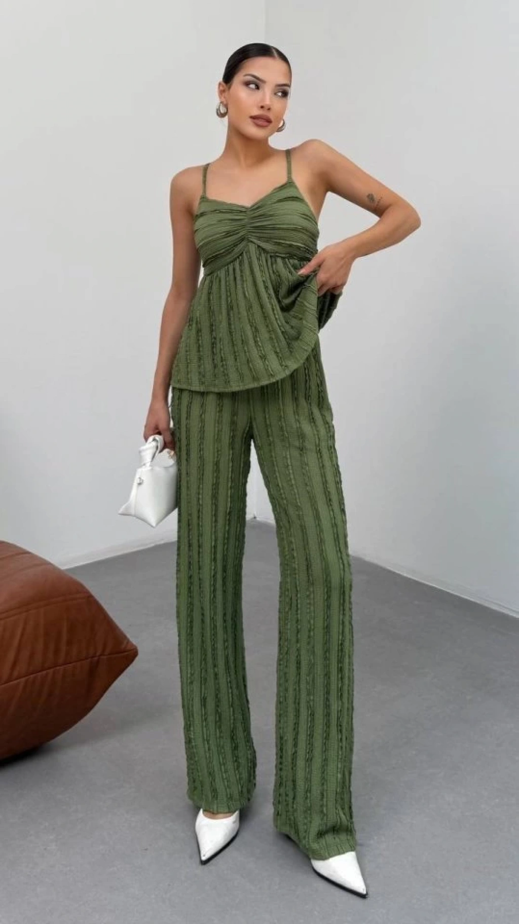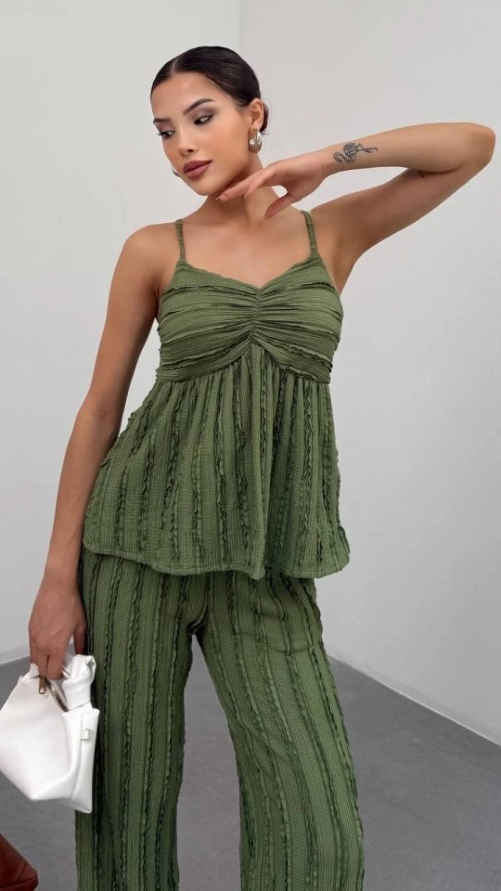 Kadın Haki Dokulu Askılı Üst Ve Bol Paça Pantolon 2’li Takım