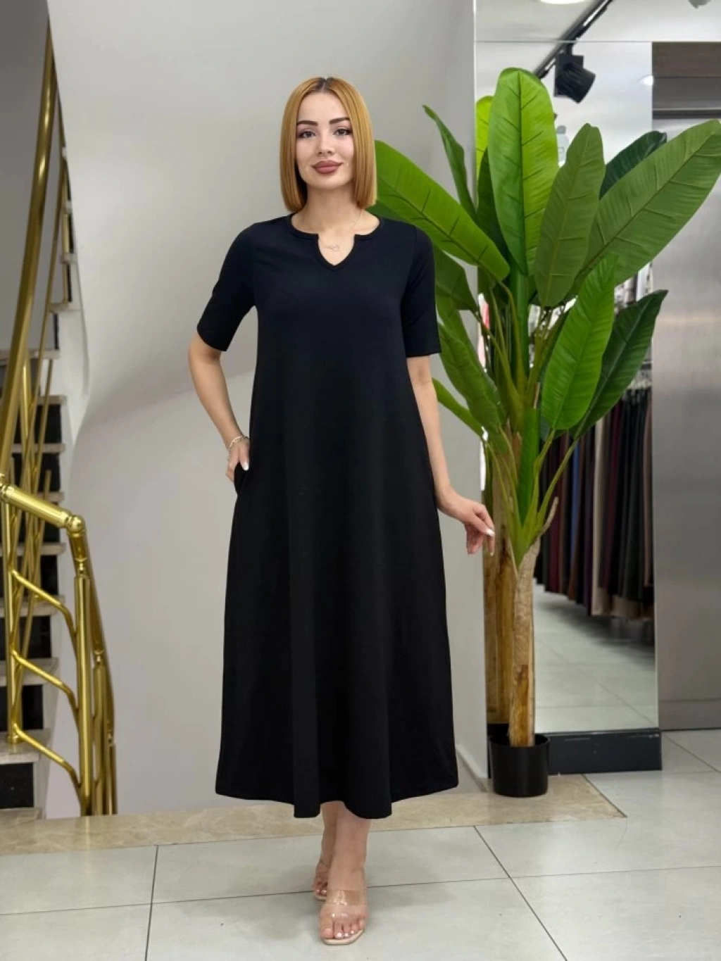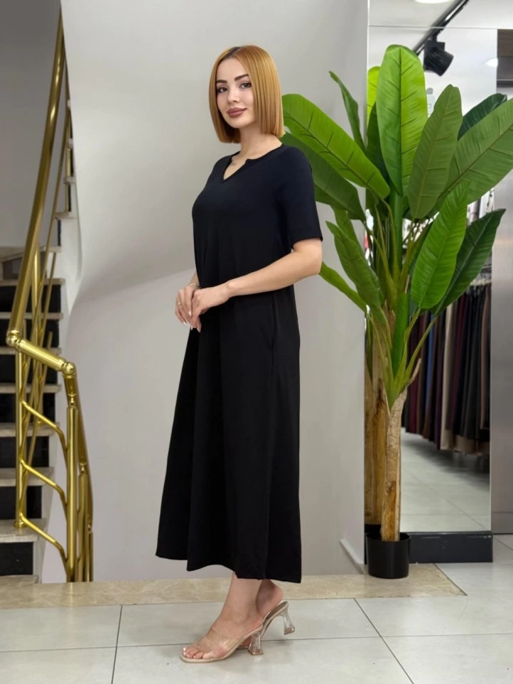 Kadın Kısa Kollu V Yakalı Cep Detaylı Uzun Janjan Krep Elbise
