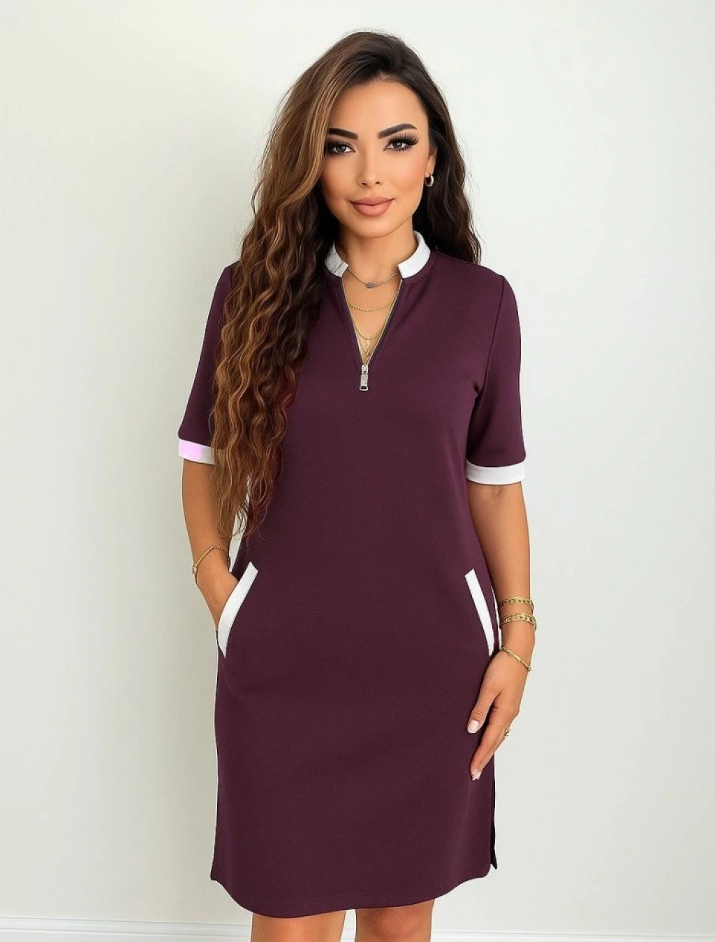 Kadın Kısa Kollu Yakadan Fermuarlı Cepli Yandan Yırtmaçlı Viskon Elbise