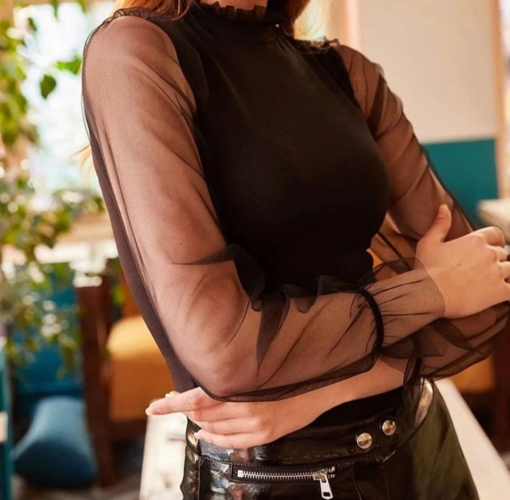 Kadın Kolları Tül Detaylı örme Krep Kumaş Bluz