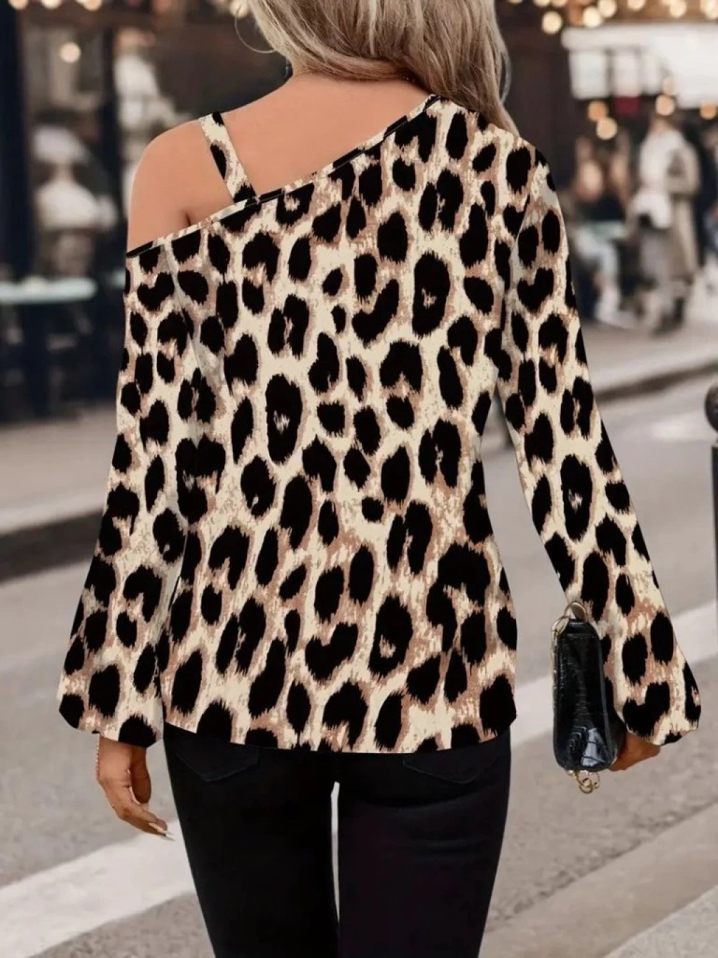 Kadın Uzun Kollu Tek Omuzu Açık Tokalı Leopar Desenli Modal Bluz