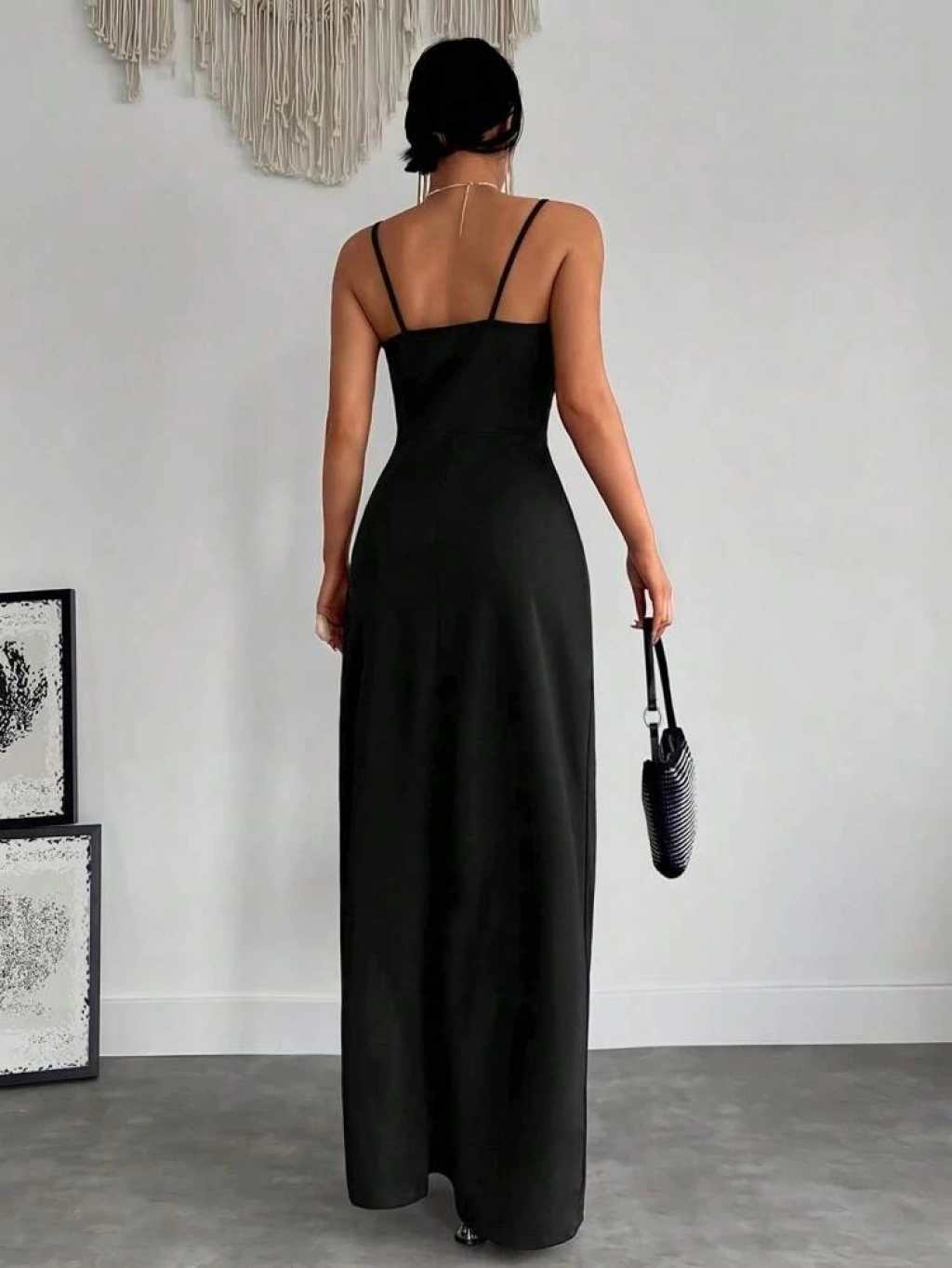 Kadın Askılı Kruvaze Yaka Derin Yırtmaçlı Krep Elbise