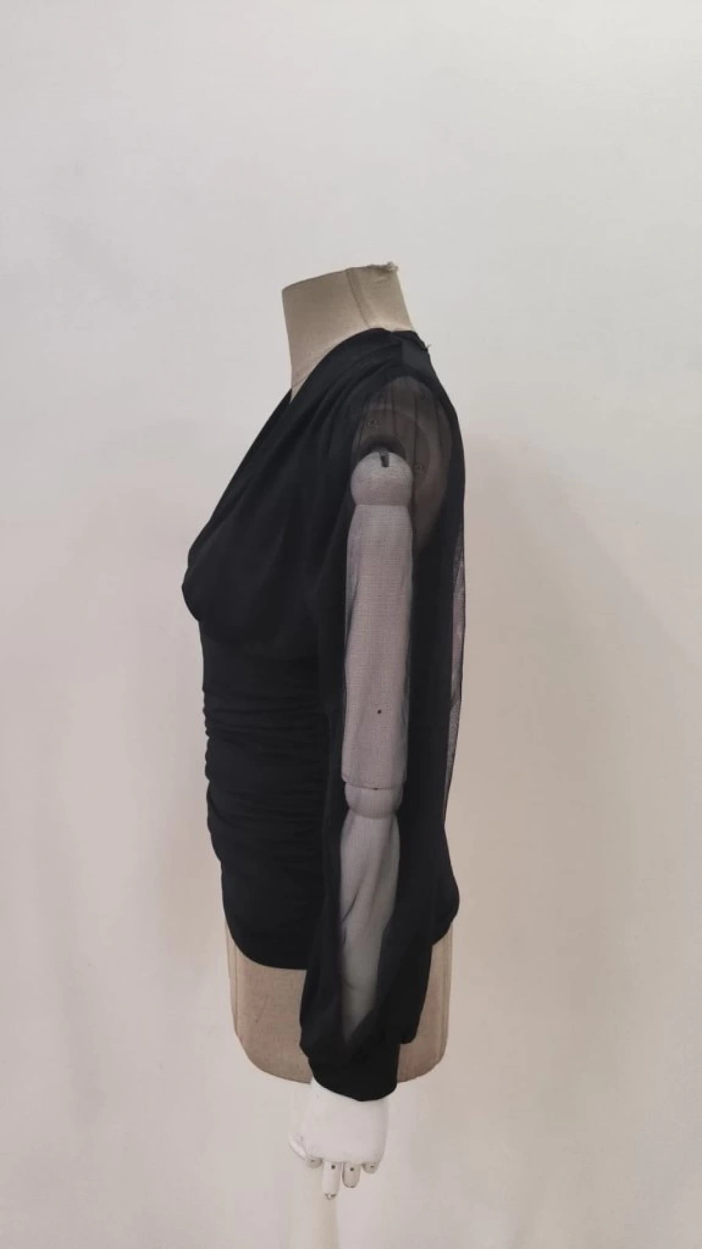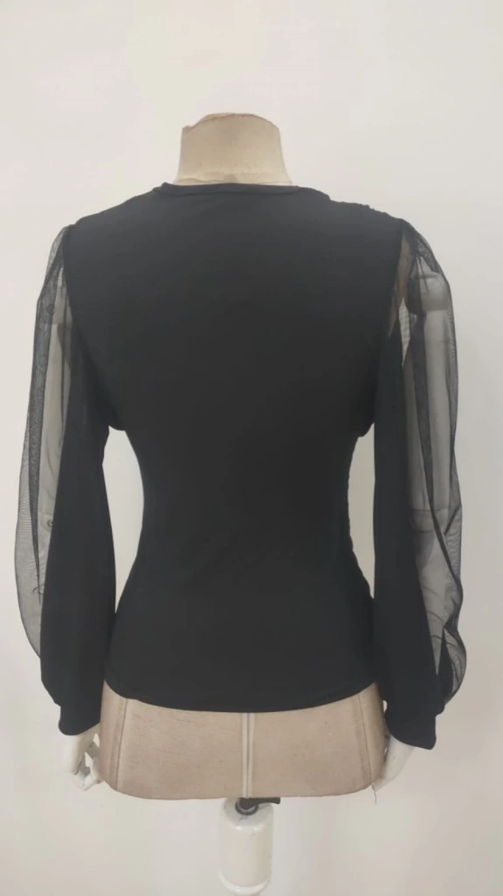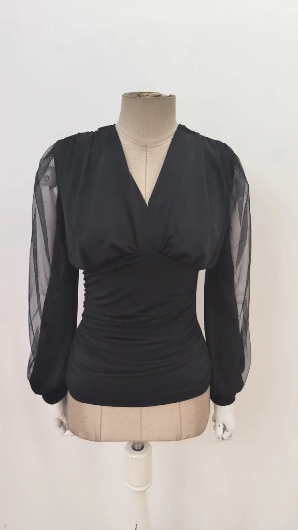 Kadın Uzun Yırtmaç Tül Detaylı Derin V Yakalı Sandy Bluz