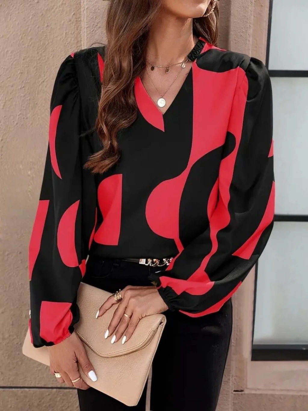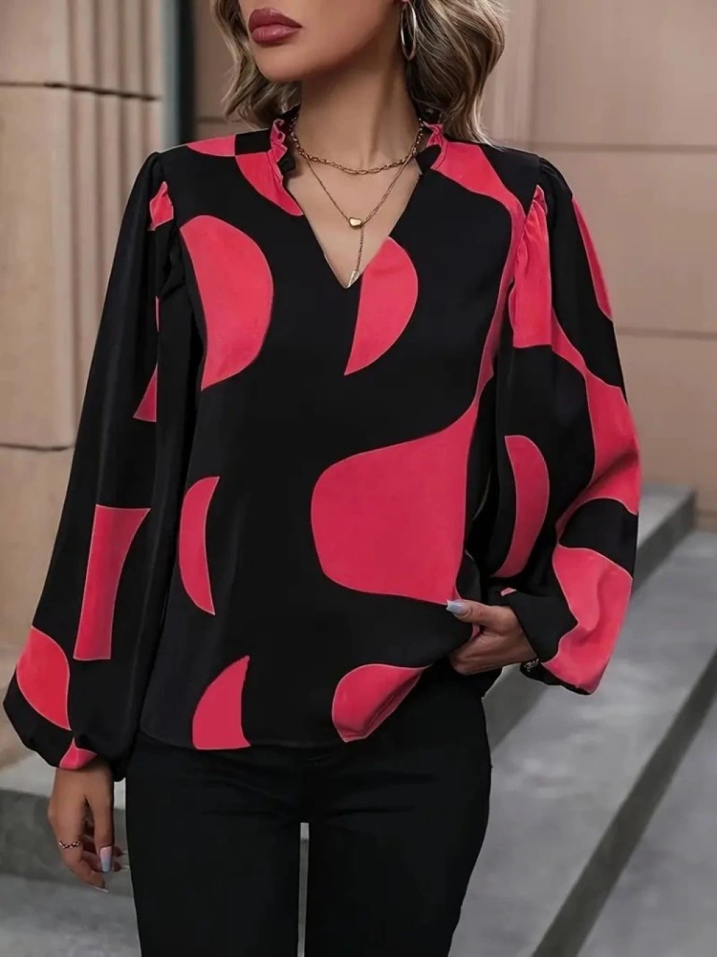 Kadın Uzun Kollu V Yakalı Desenli Modal Bluz