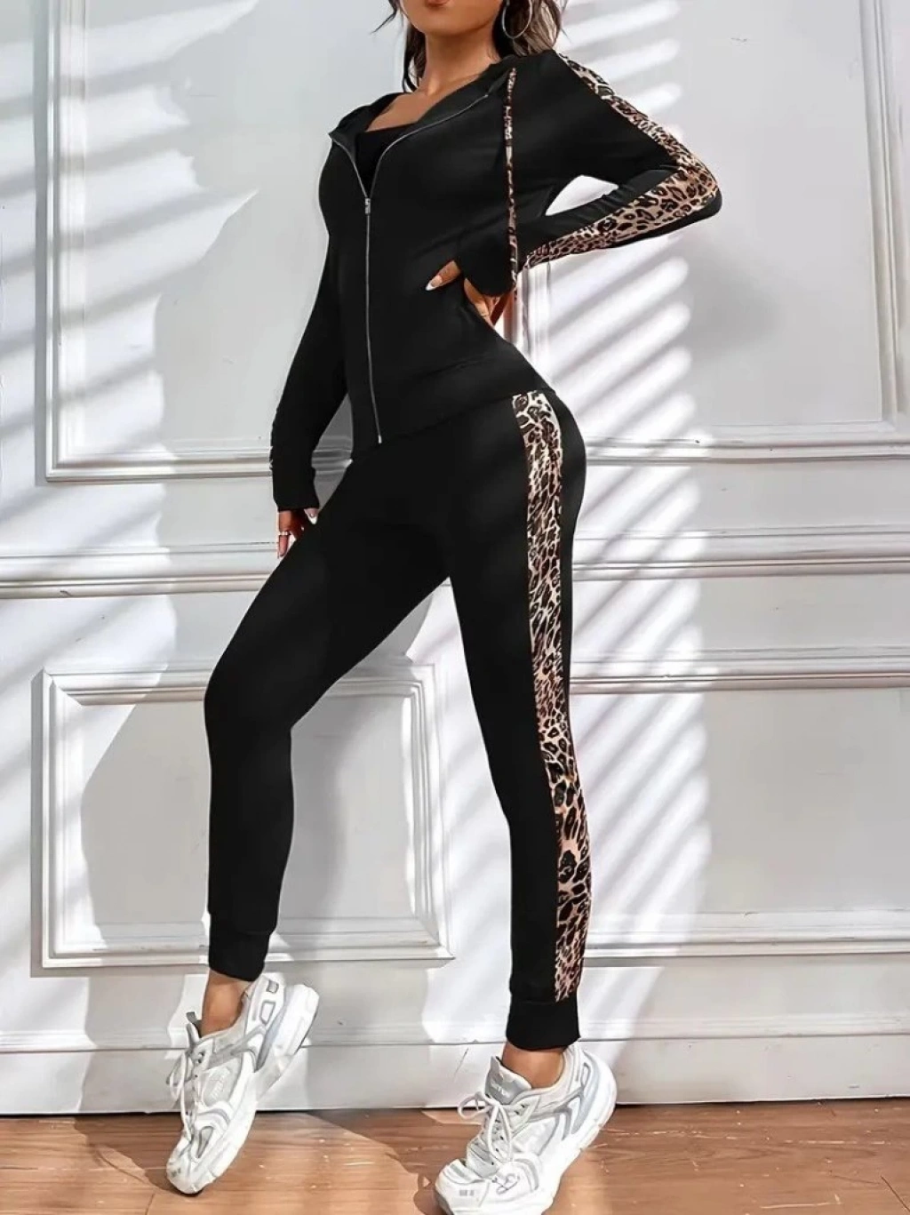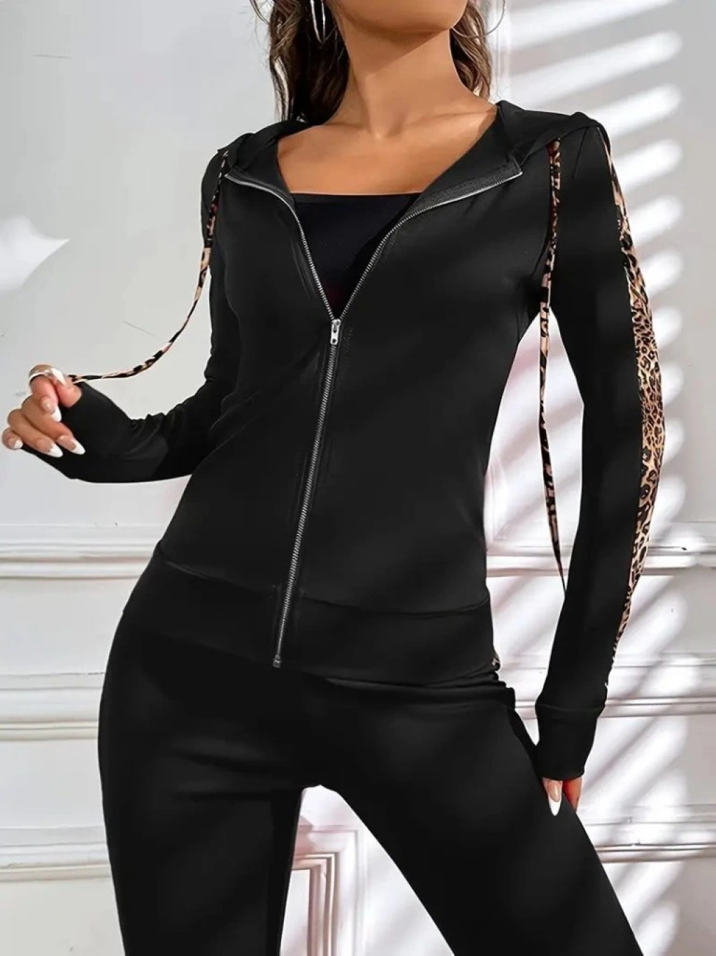 Kadın Uzun Kollu Kapşonlu Fermuarlı Bağcıklı Viskon Iki Iplik Bluz Ve Pantolon Tayt