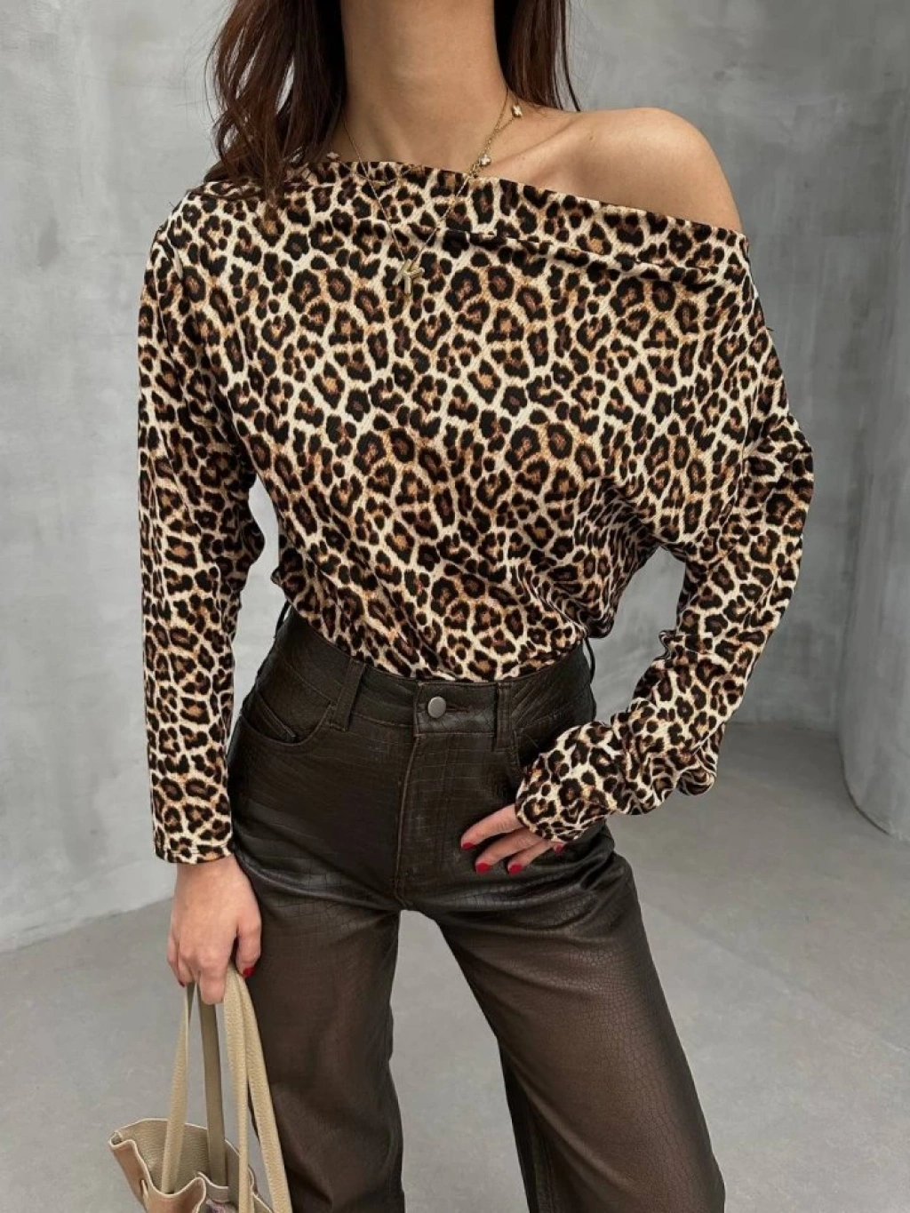 Kadın Leopar Desenli Düşük Omuzlu Bluz