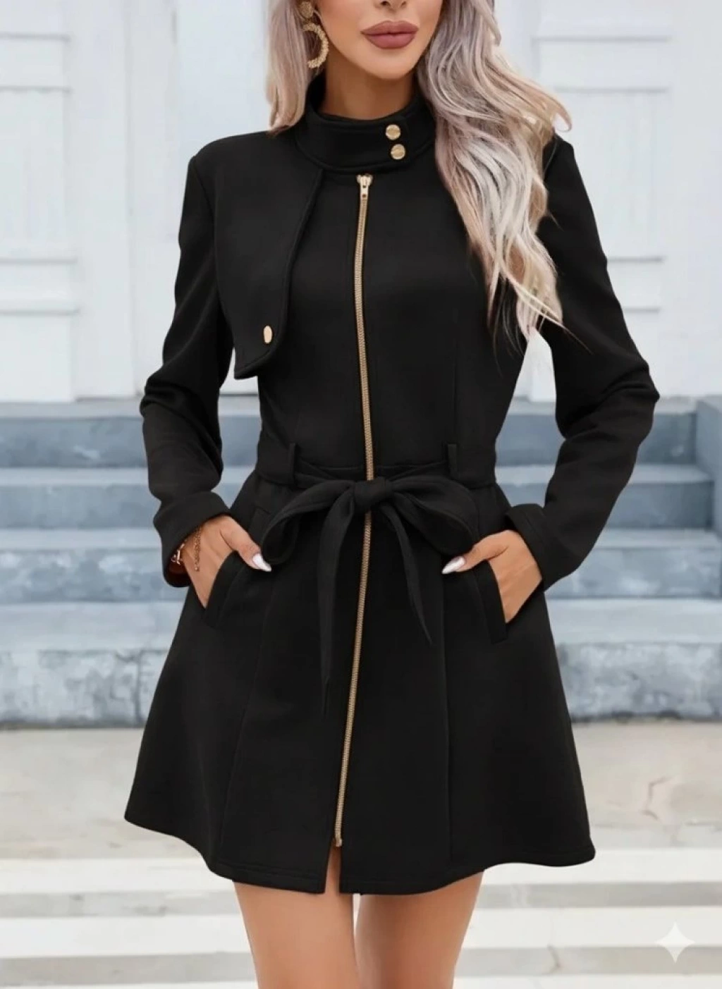 Kadın Uzun Kollu Boyundan Düğmeli Fermuarlı Beli Kuşaklı Süet Ceket