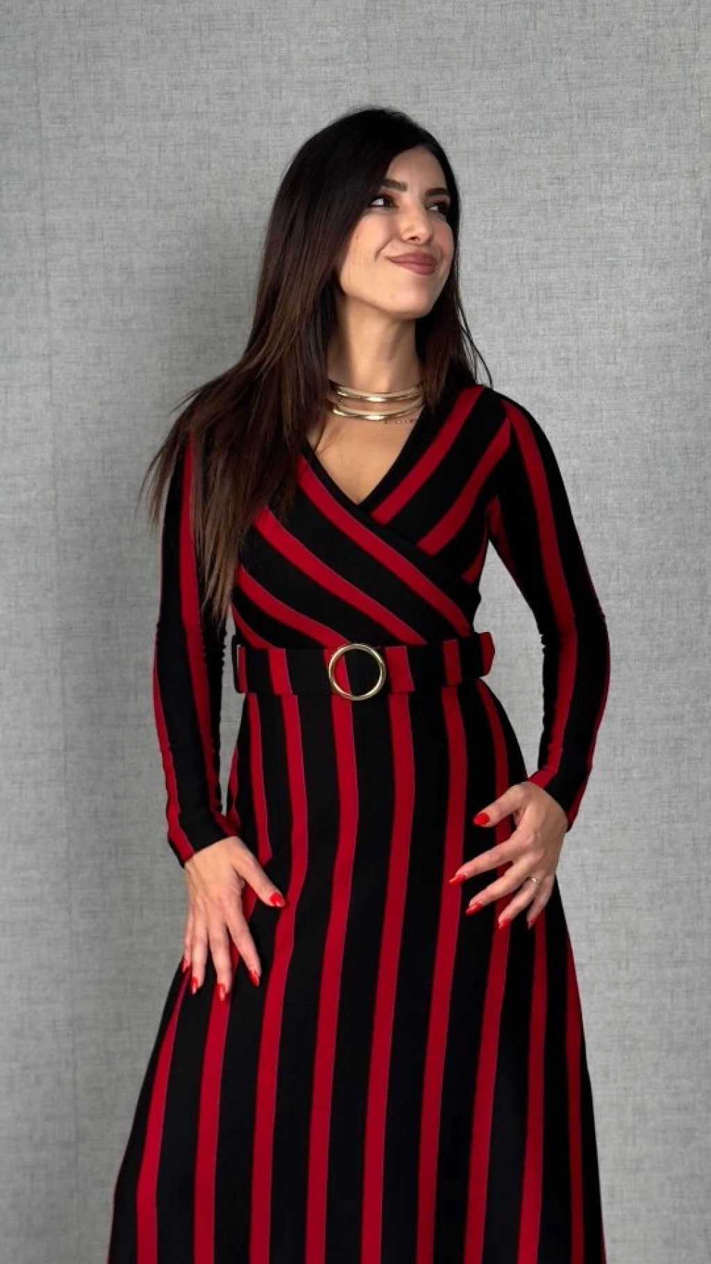 Kadın Uzun Kollu Kruvaze Yaka Kemer Dahil çizgili Triko Elbise
