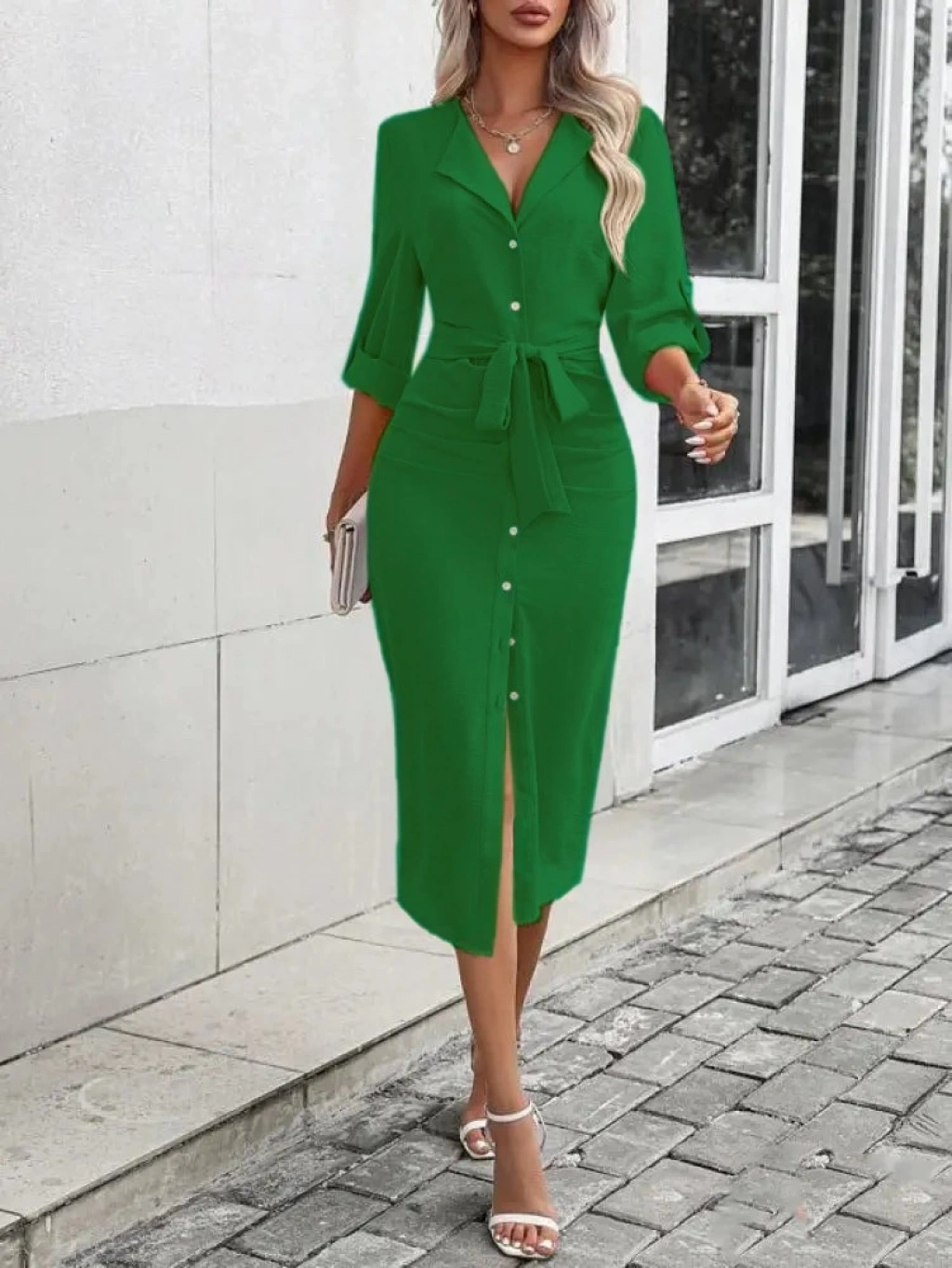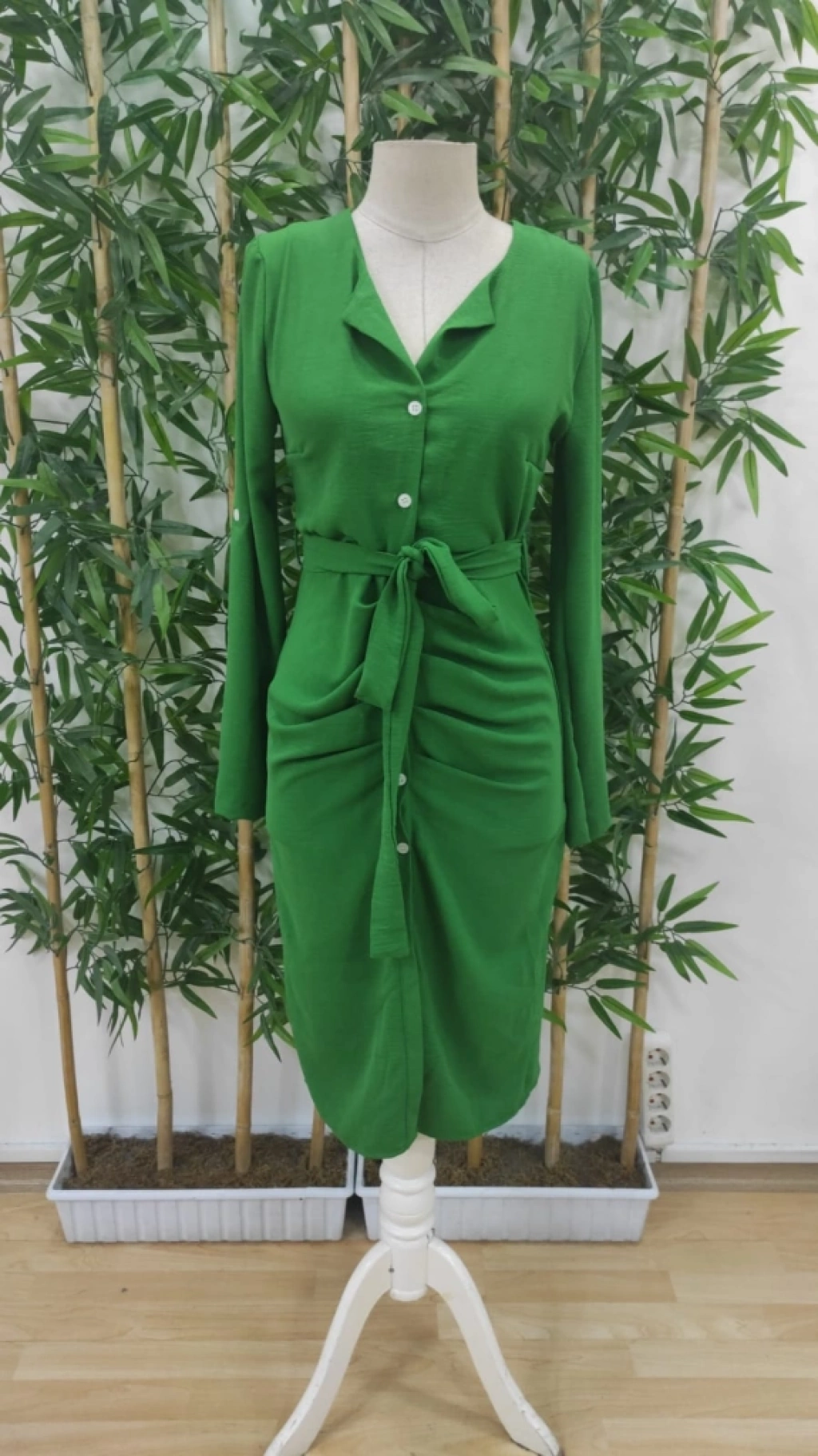 Kadın Uzun Kollu önden Düğmeli Beli Kuşaklı Aerobin Midi Elbise
