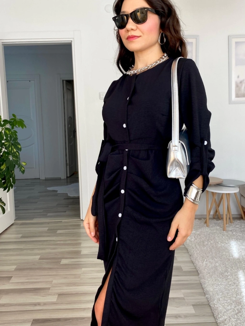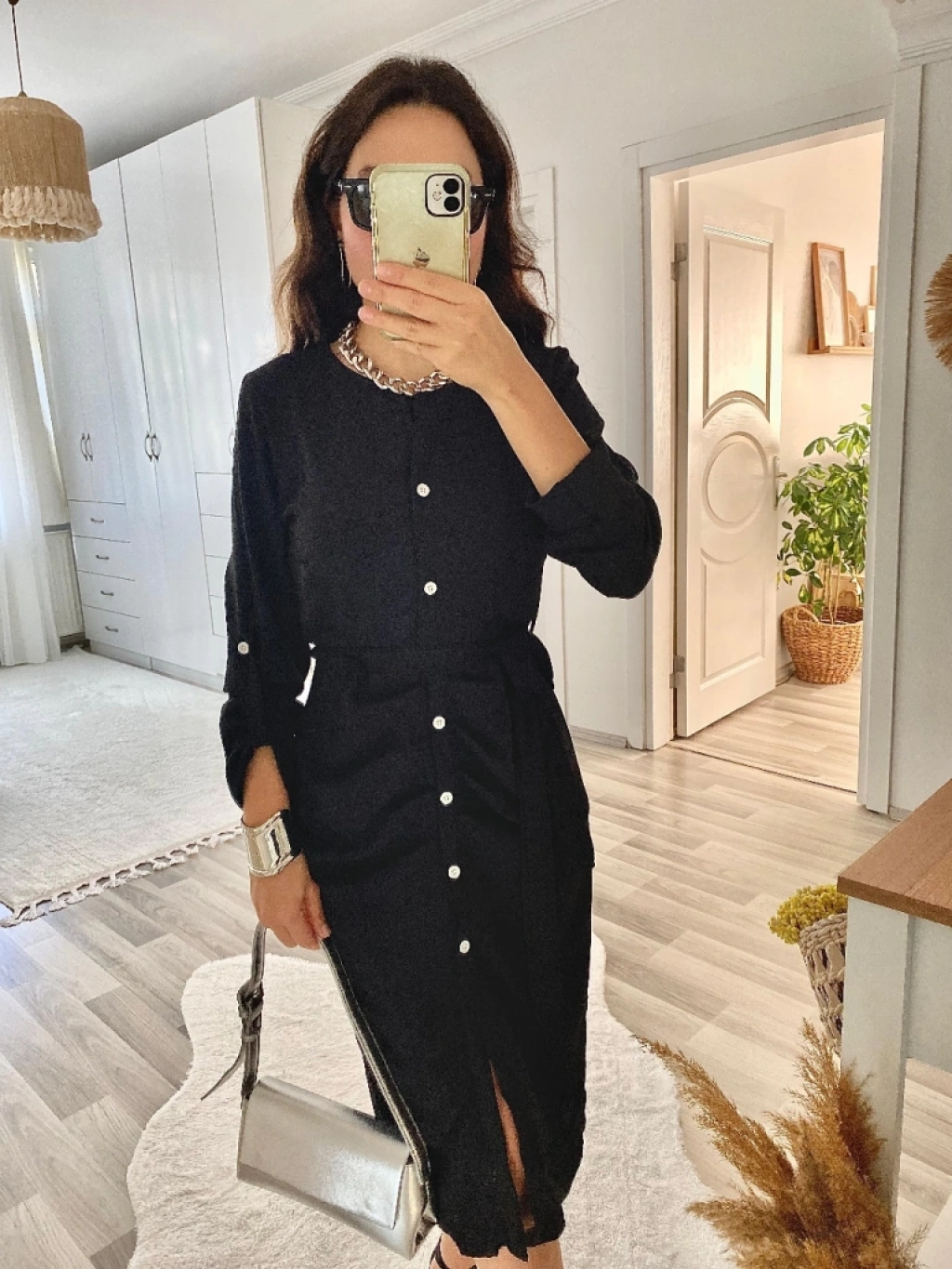 Kadın Uzun Kollu önden Düğmeli Beli Kuşaklı Aerobin Midi Elbise
