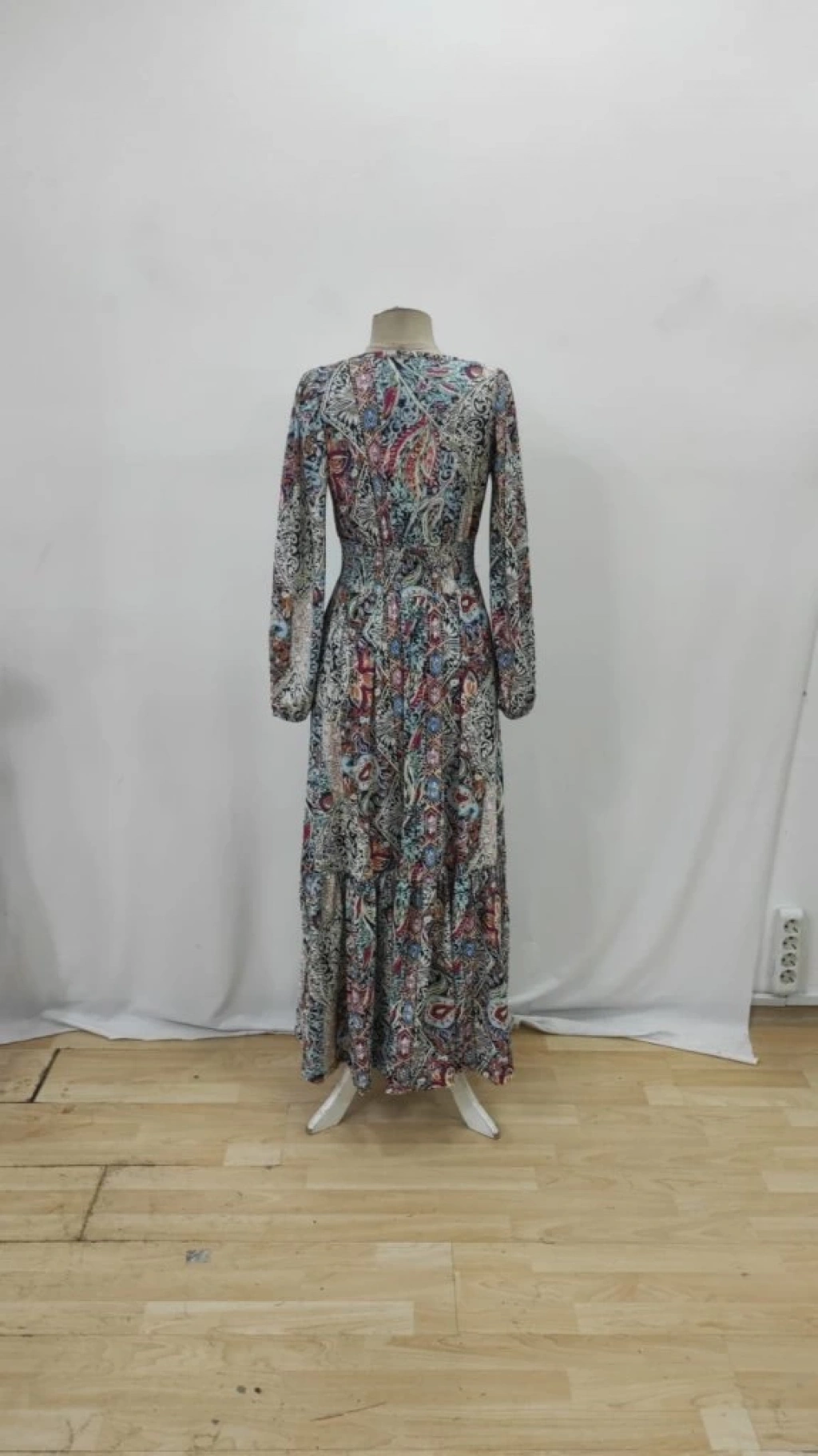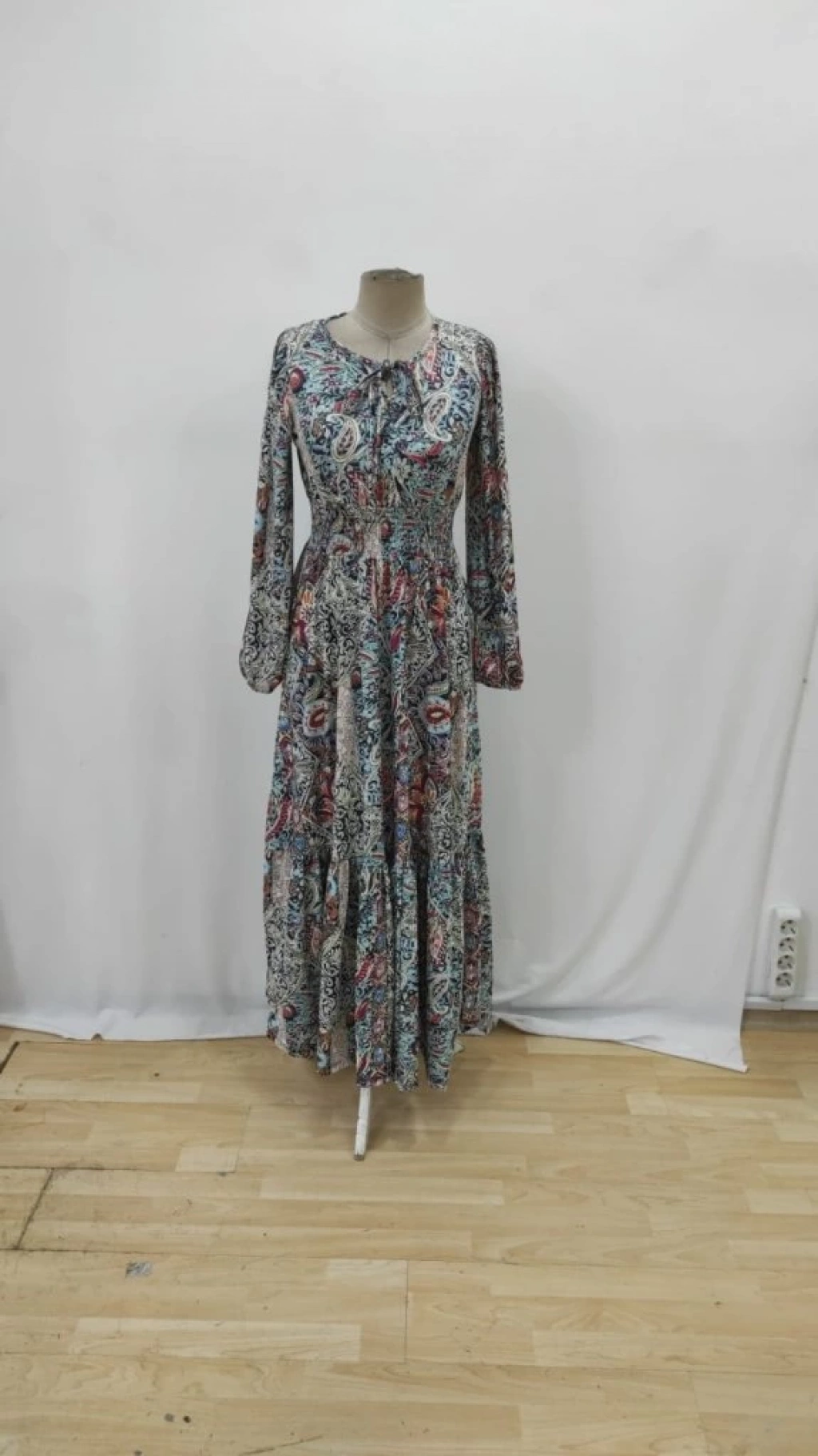 Kadın Uzun Kollu Uakadabağcıklı Beli Lastikli Desenli Uzun Süprem Elbise