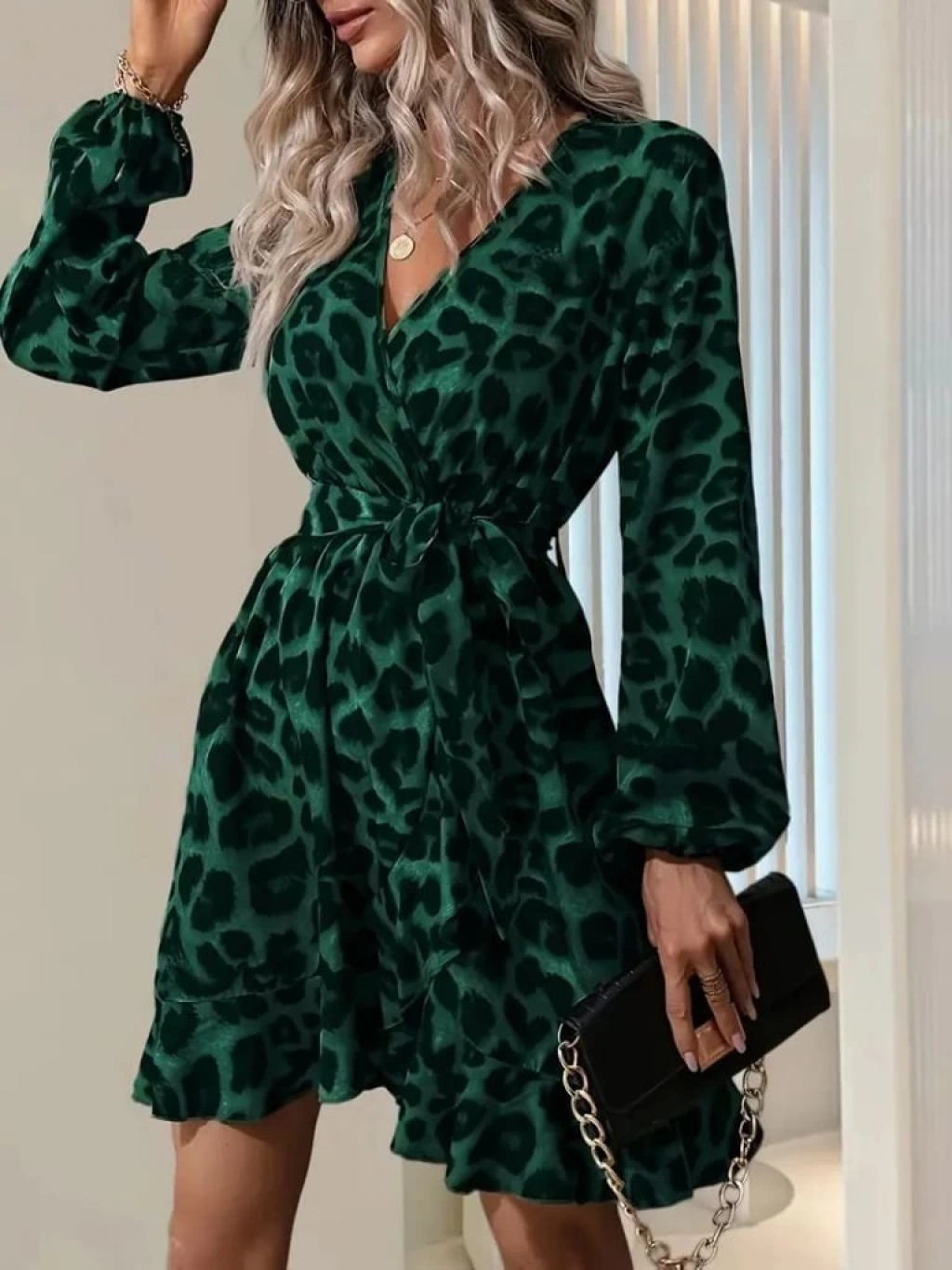 Kadın Uzun Kollu Kruvaze Yaka Beden Kuşaklı çapraz Kesim Detaylı Leopar Modal Mini Elbise