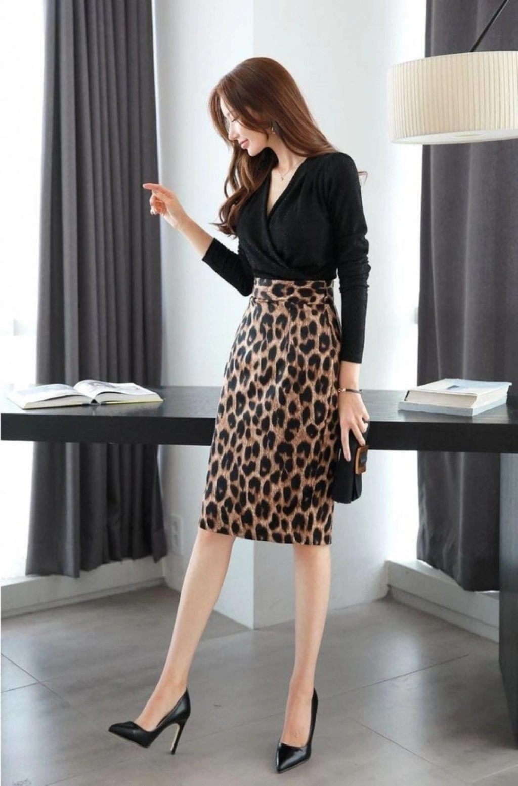 Kadın Uzun Kollu Kruvaze Yaka üst Ithal Krep Alt Dalgıç Leopar Detaylı Elbise
