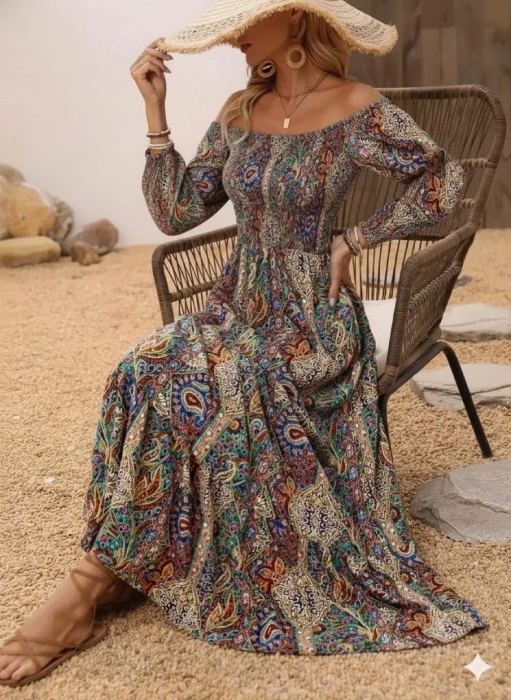 Kadın Düşük Omuzlu Beli Büzgülü Dijital Desenli Kesik Elyaf Süprem Uzun Elbise