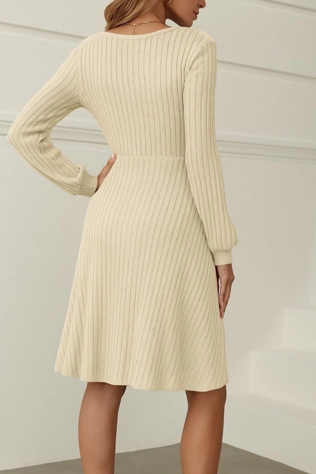 Kadın Uzun Kollu Kare Yaka Düğmeli Kısa şardonlu Iki Iplik Mini Elbise