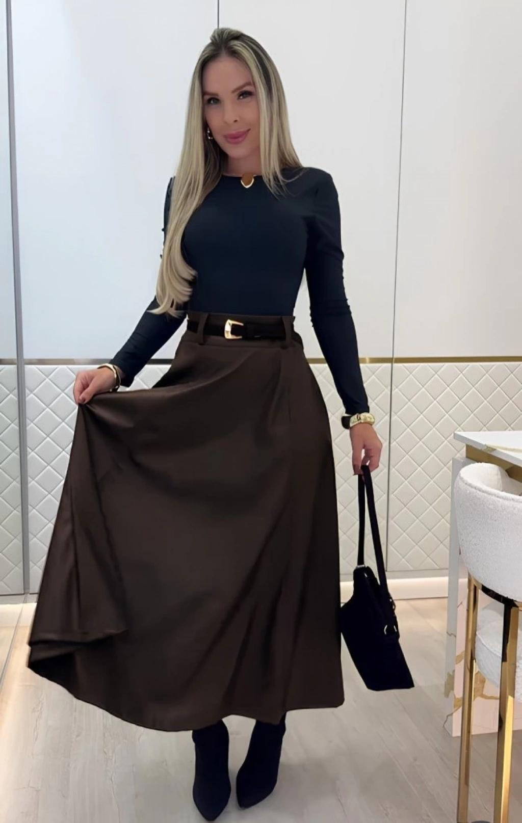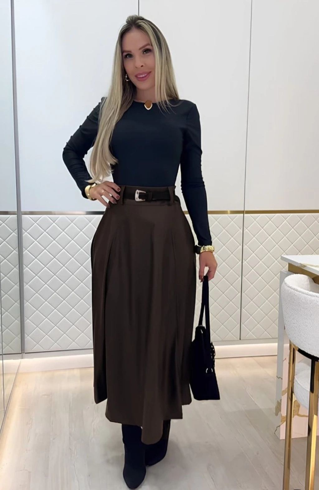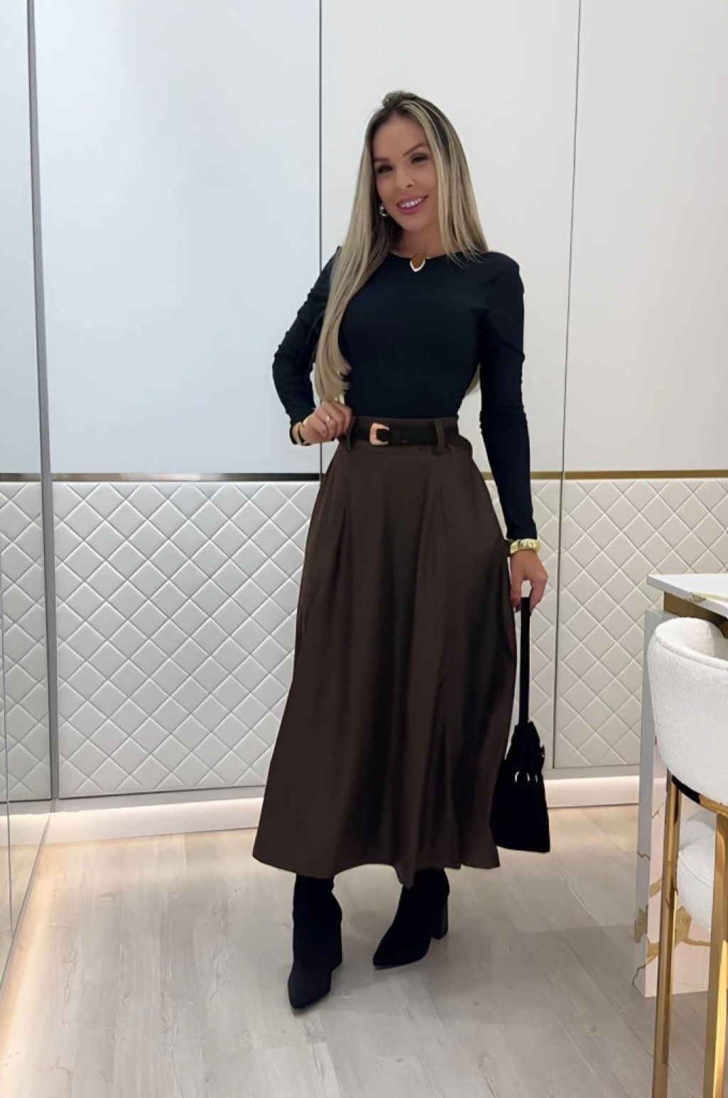 Kadın Yüksek Belli Maxi Deri Kemersiz Etek