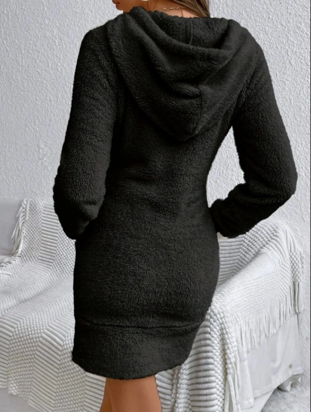 Kadın Uzun Kollu Kapşonlu Cepli Mini Peluş Elbise