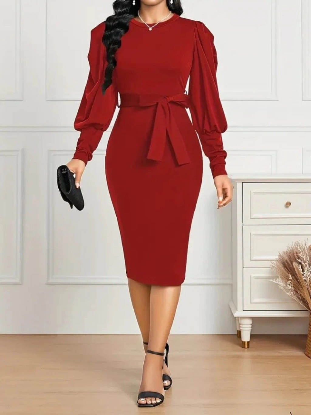 Kadın Uzun Kollu Bisiklet Yaka Beli Kuşaklı Ithal Krep Midi Elbise