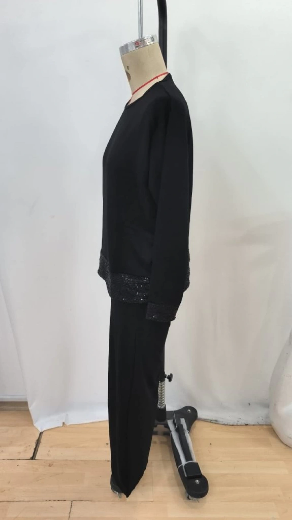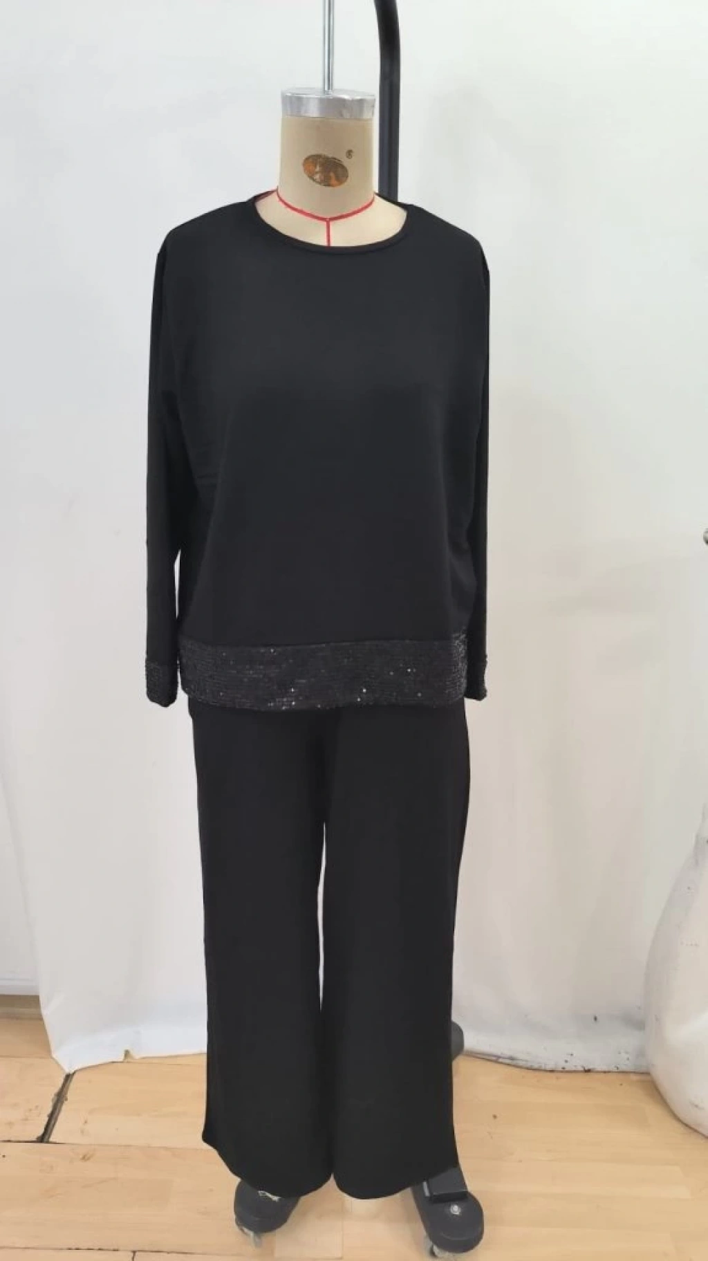 Kadın Uzun Kollu Bisiklet Yaka Pulpayetli Viskon Iki Iplik Bluz Ve Pantolon Ikili Takım