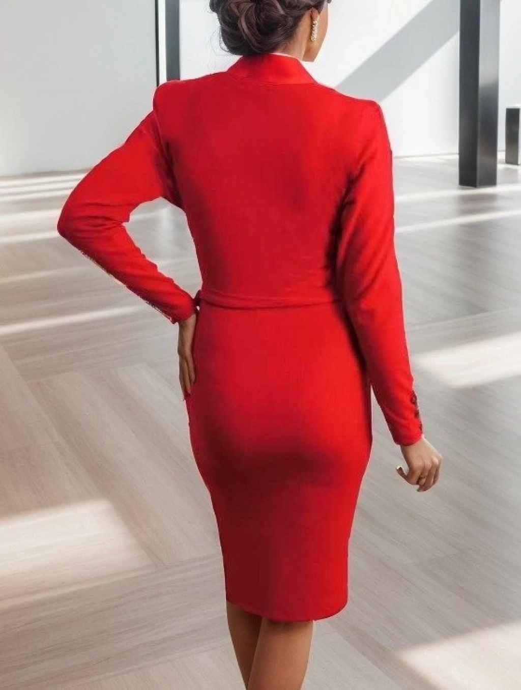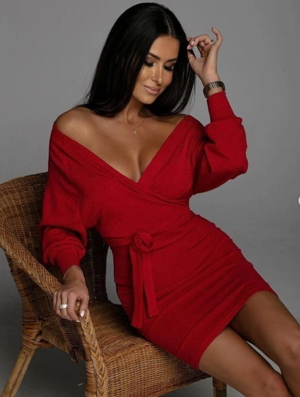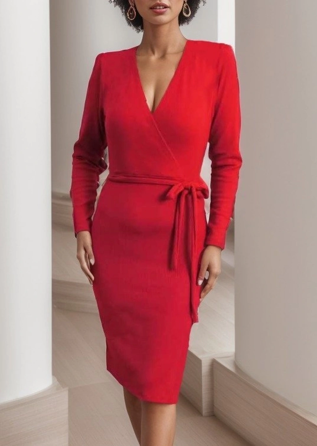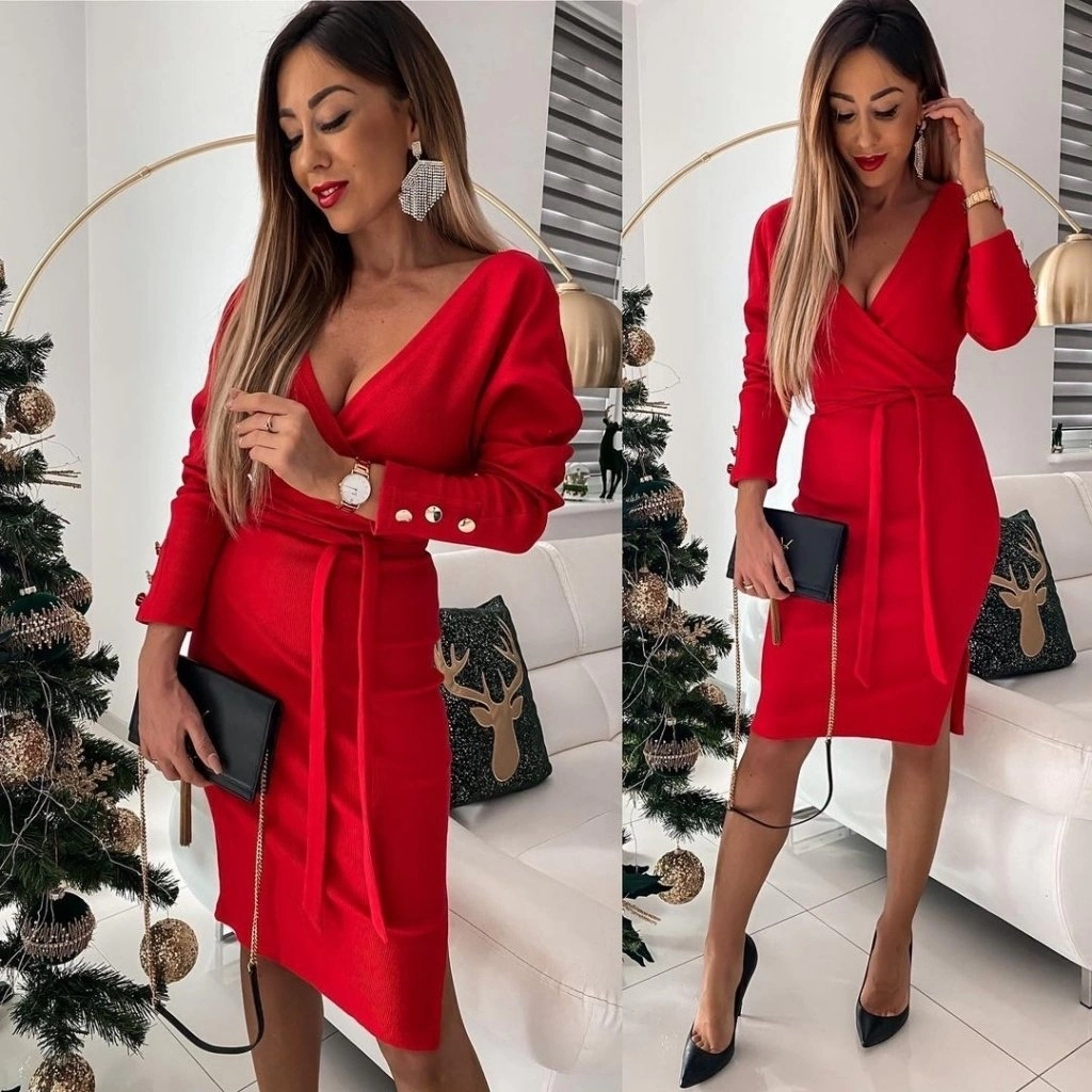 Kadın Uzun Kollu Kruvaze Yaka Bağcık Detay Akrilik Mini Boy Elbise
