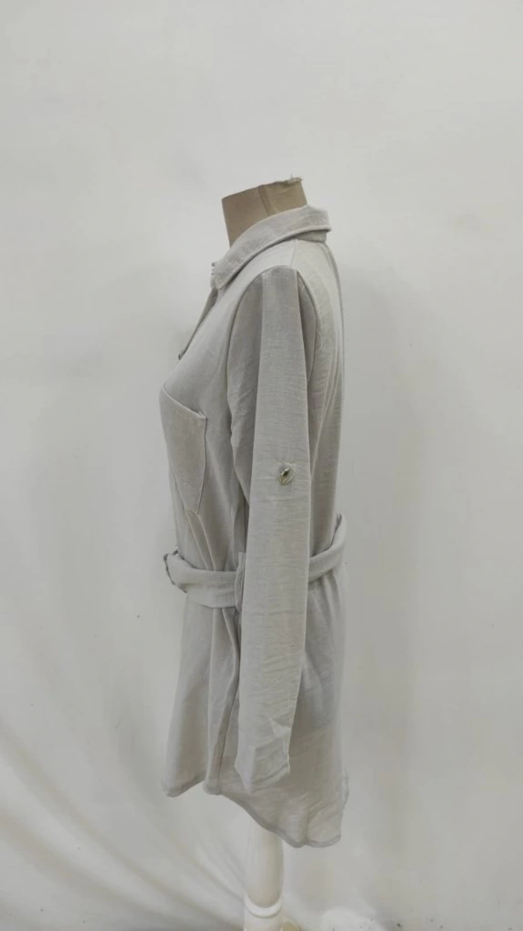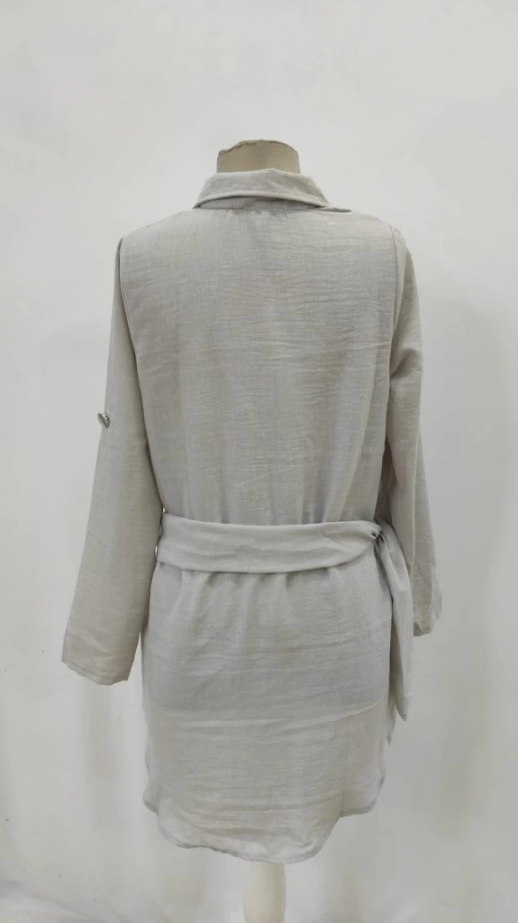 Kadın Uzun Kollu Yakalı önden Düğmeli Beli Kuşaklı Mini Ithal Keten Elbise