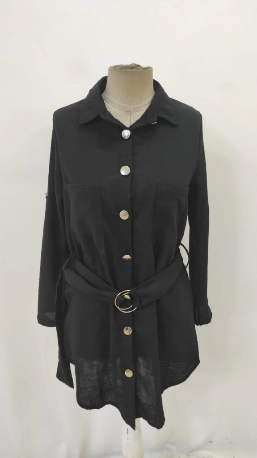 Kadın Uzun Kollu Yakalı önden Düğmeli Beli Kuşaklı Mini Ithal Keten Elbise