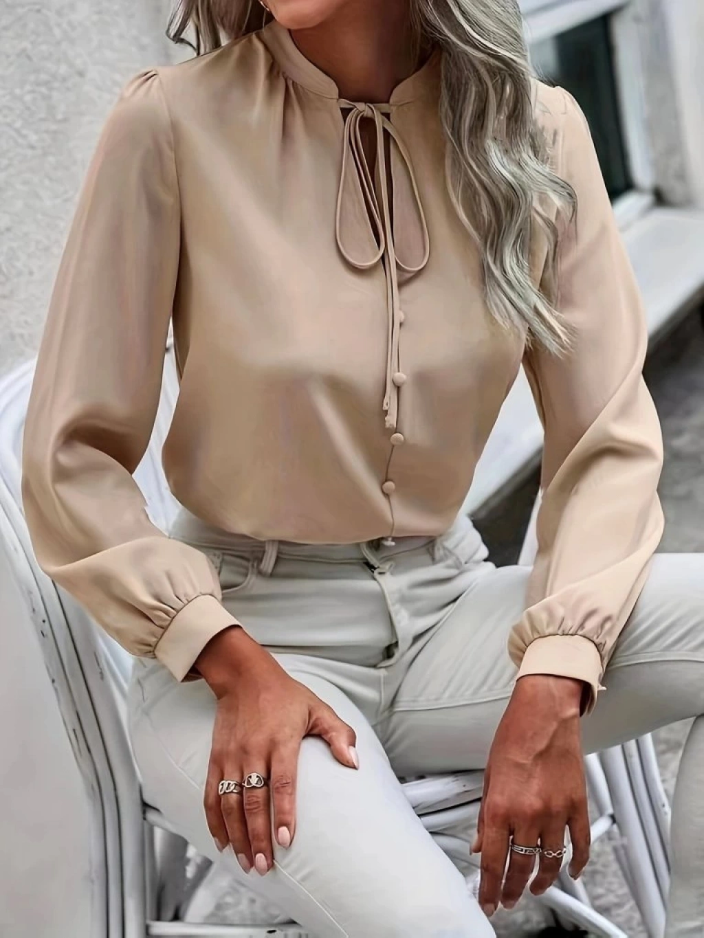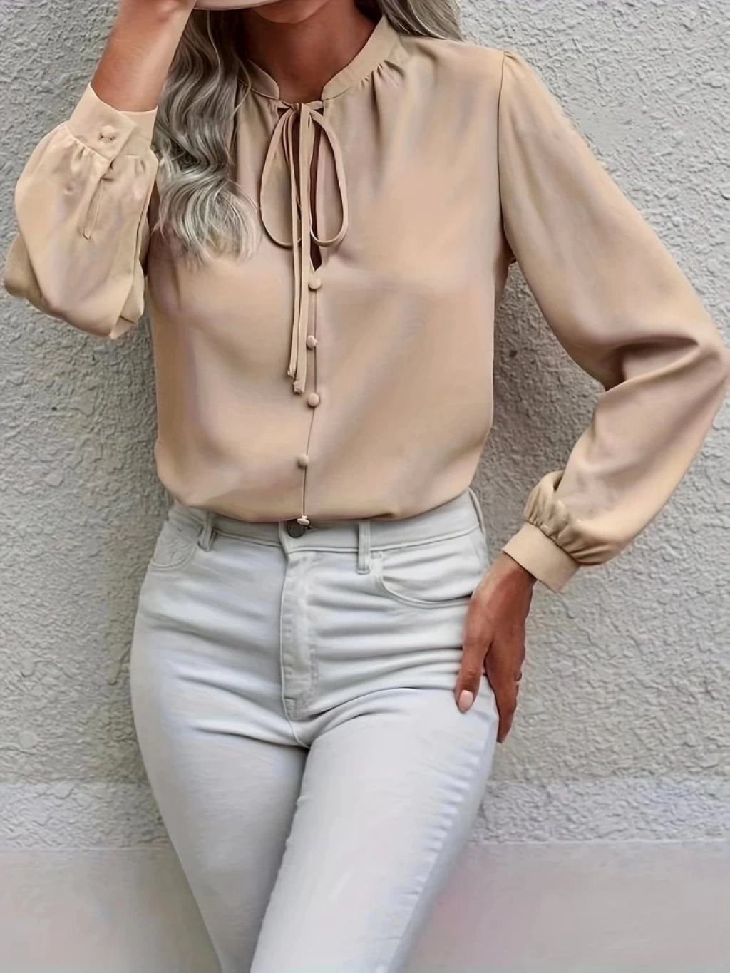 Kadın Uzun Kollu Yakalı Yakadan Bağcıklı Düğmeli Sandy Bluz