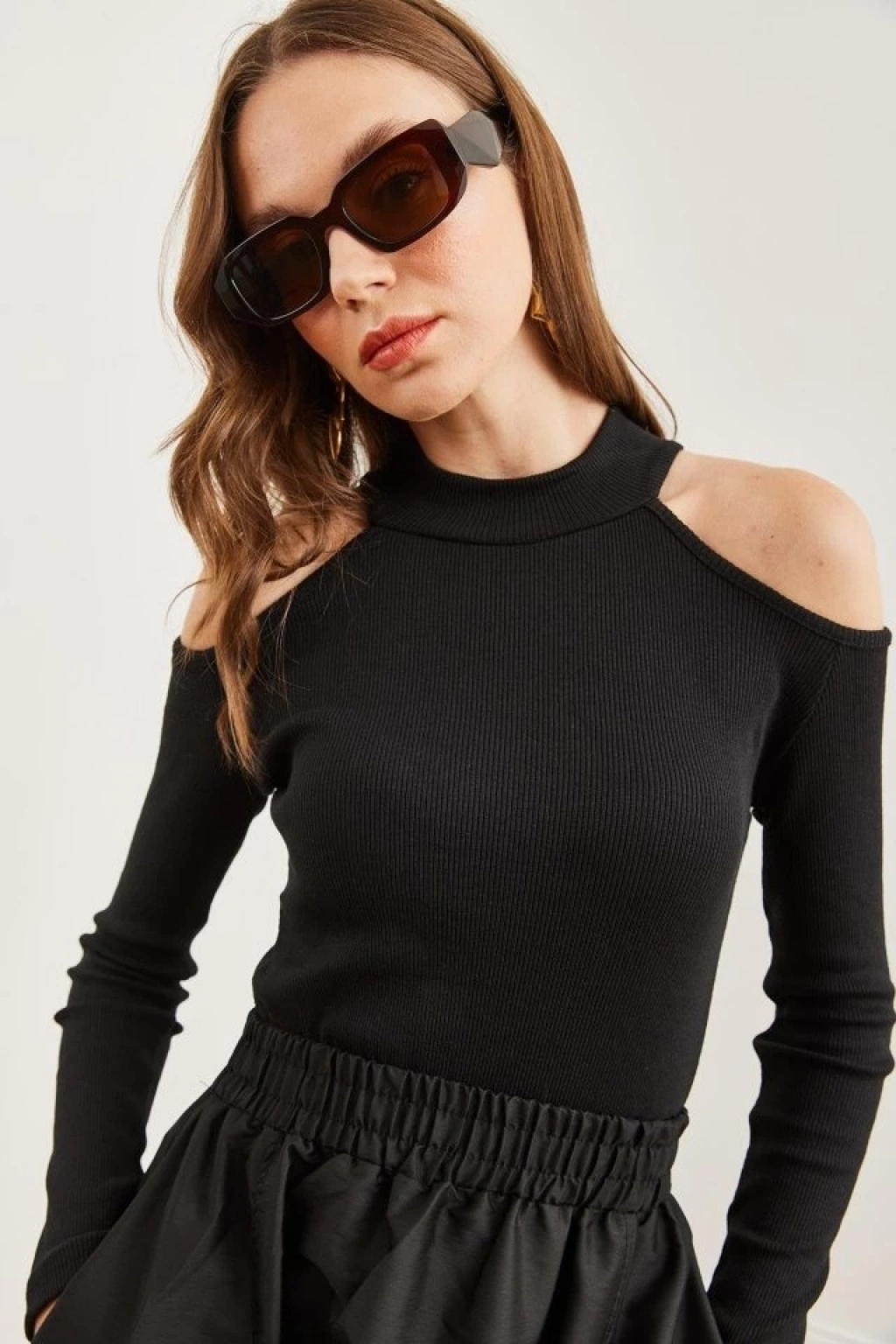 Kadın Uzun Kollu Omuz Dekolteli Kaşkorse Kumaş Bluz