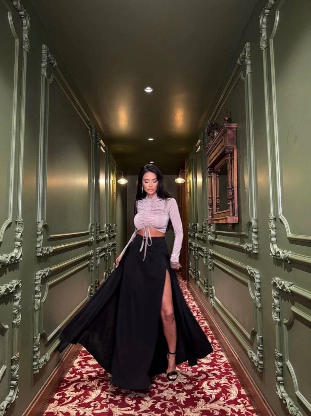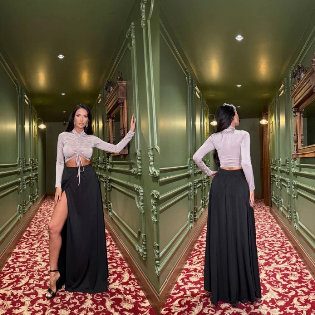 Kadın Asansör Büzgü Detay Krom Ve Derin Yırtmaçlı Maxi Boy Etek Ikili Takım