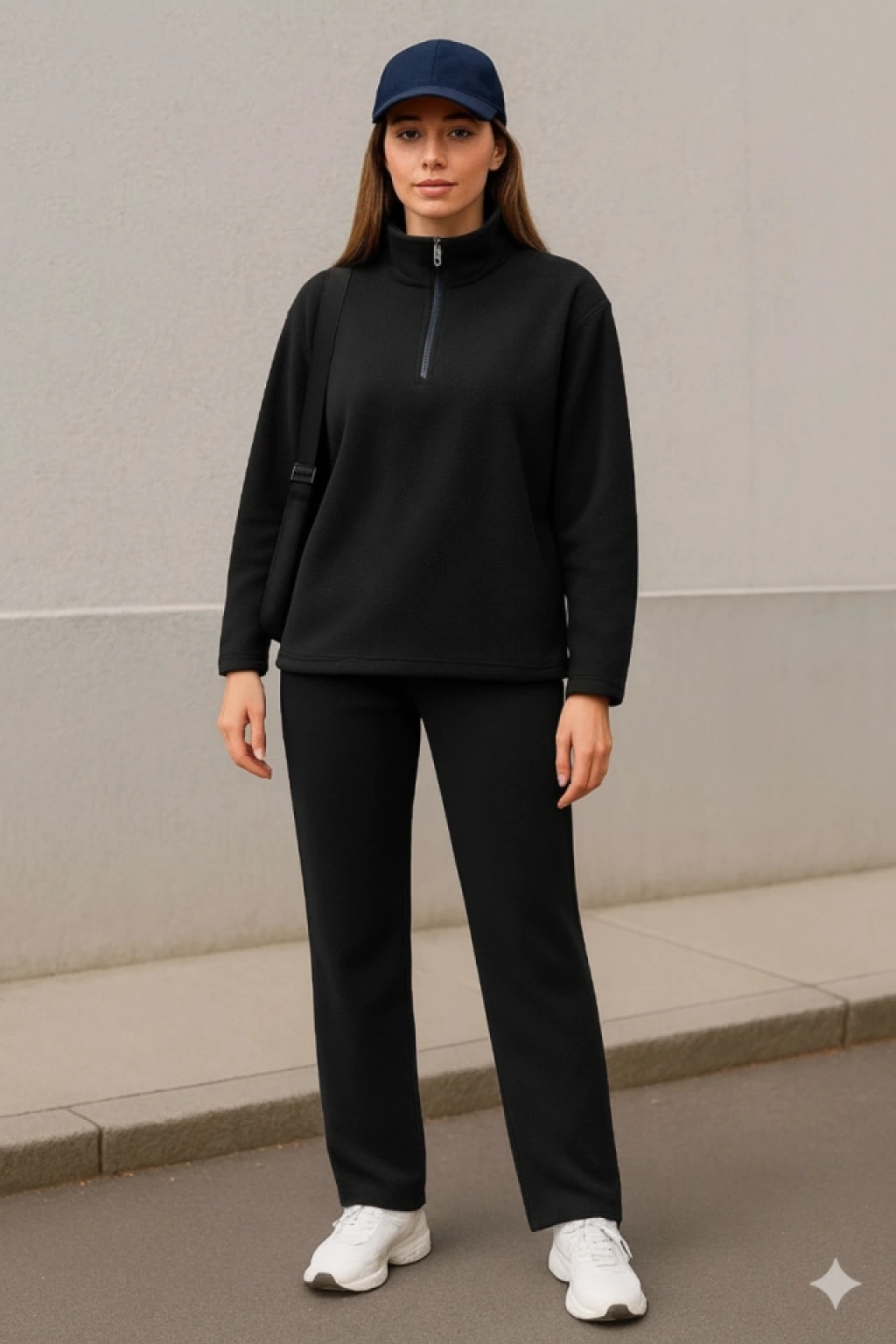 Kadın Balıkçı Yaka Fermuar Detay Polar Sweat Ve Pantolon Ikili Takım
