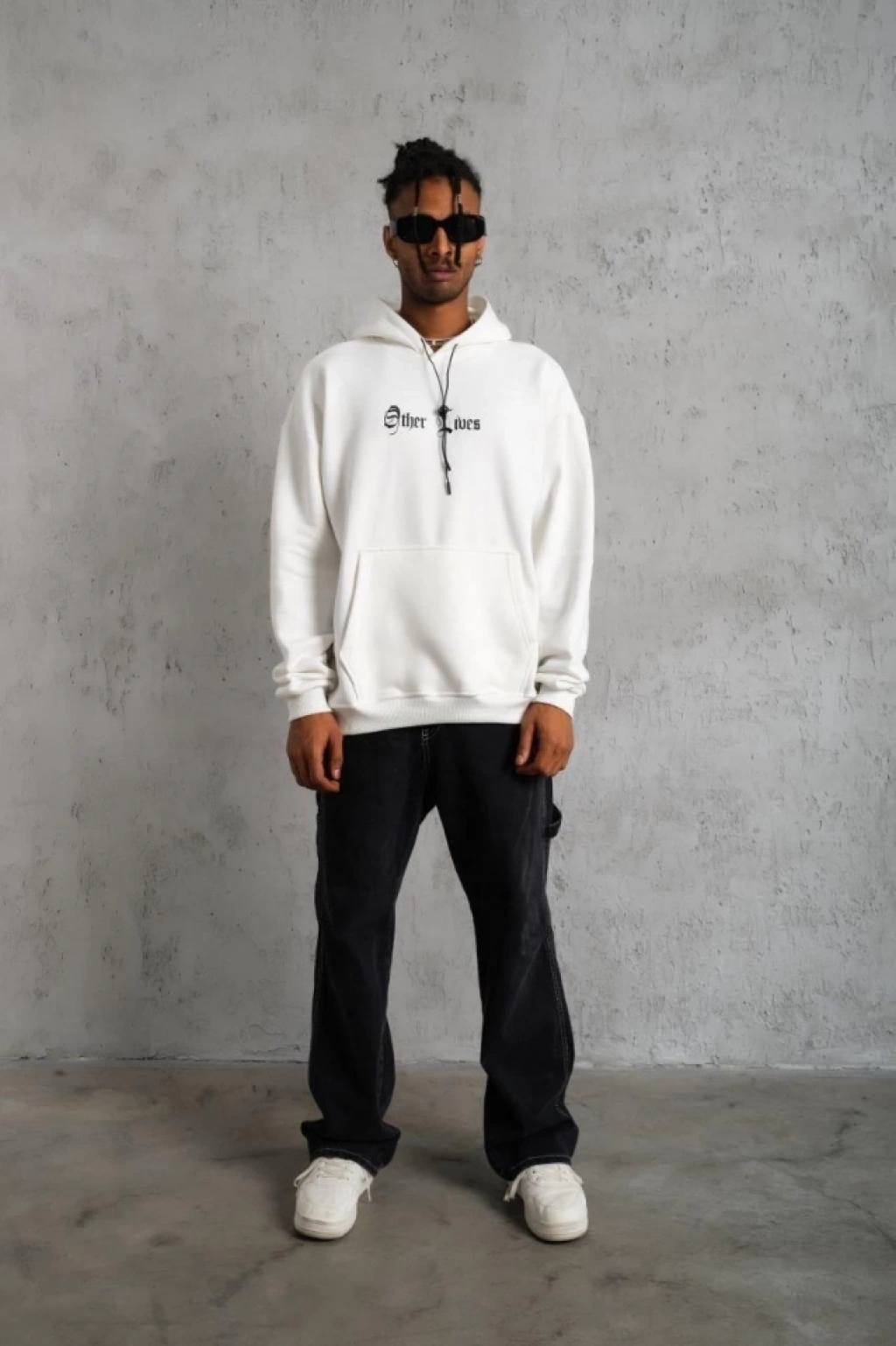 Oversize Üç İplik Şardonlu Kapüşonlu Sweatshirt – Beyaz “Other Lives” Ön Ve Arka Baskılı, Kanguru Cepli, Ribanalı Rahat Kışlık Model Beyaz