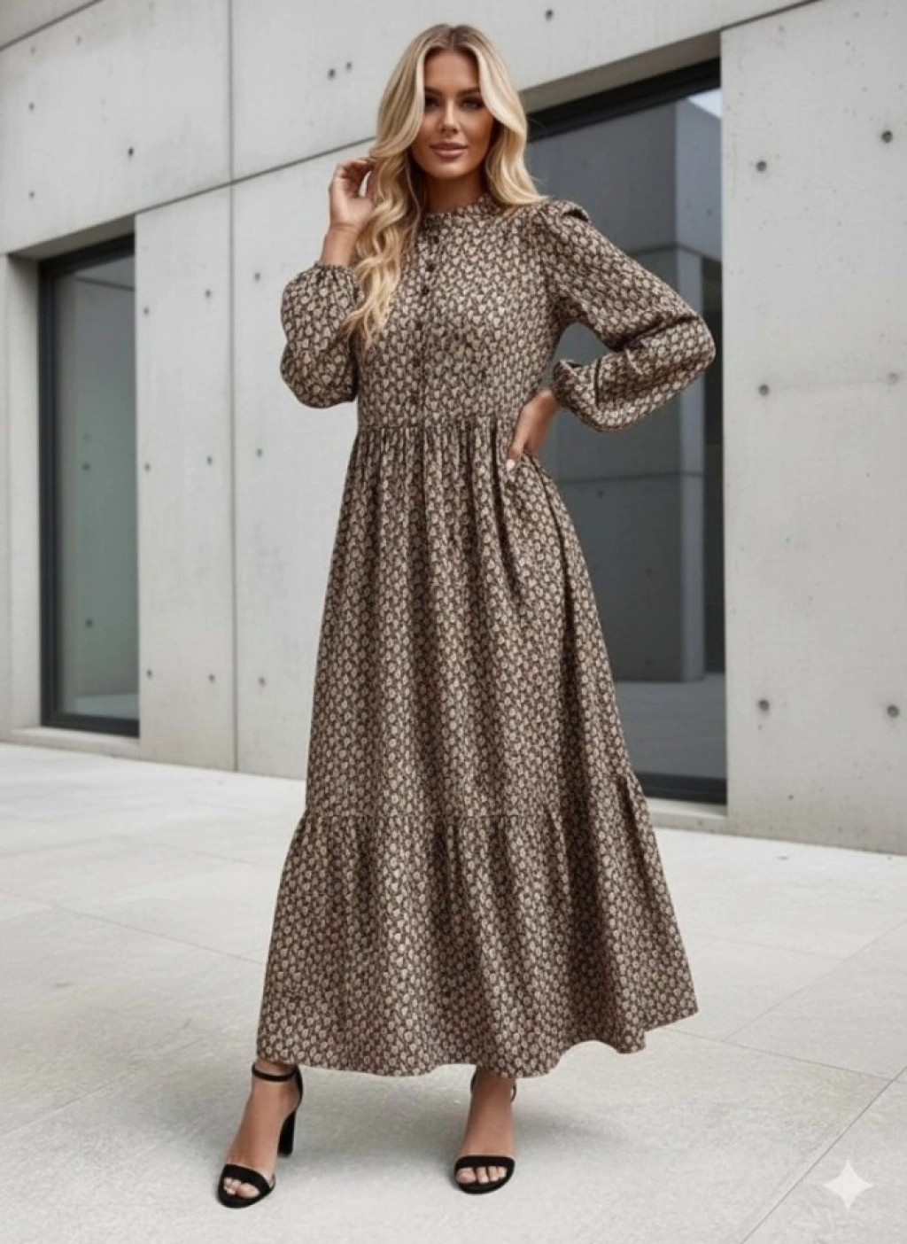 Kadın Uzun Kollu Hakim Yakalı Düğmeli Kemersiz Desenli Maxi Süprem Elbise