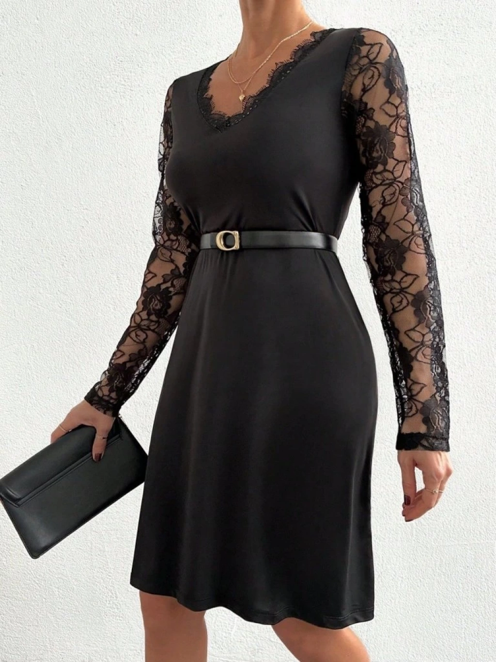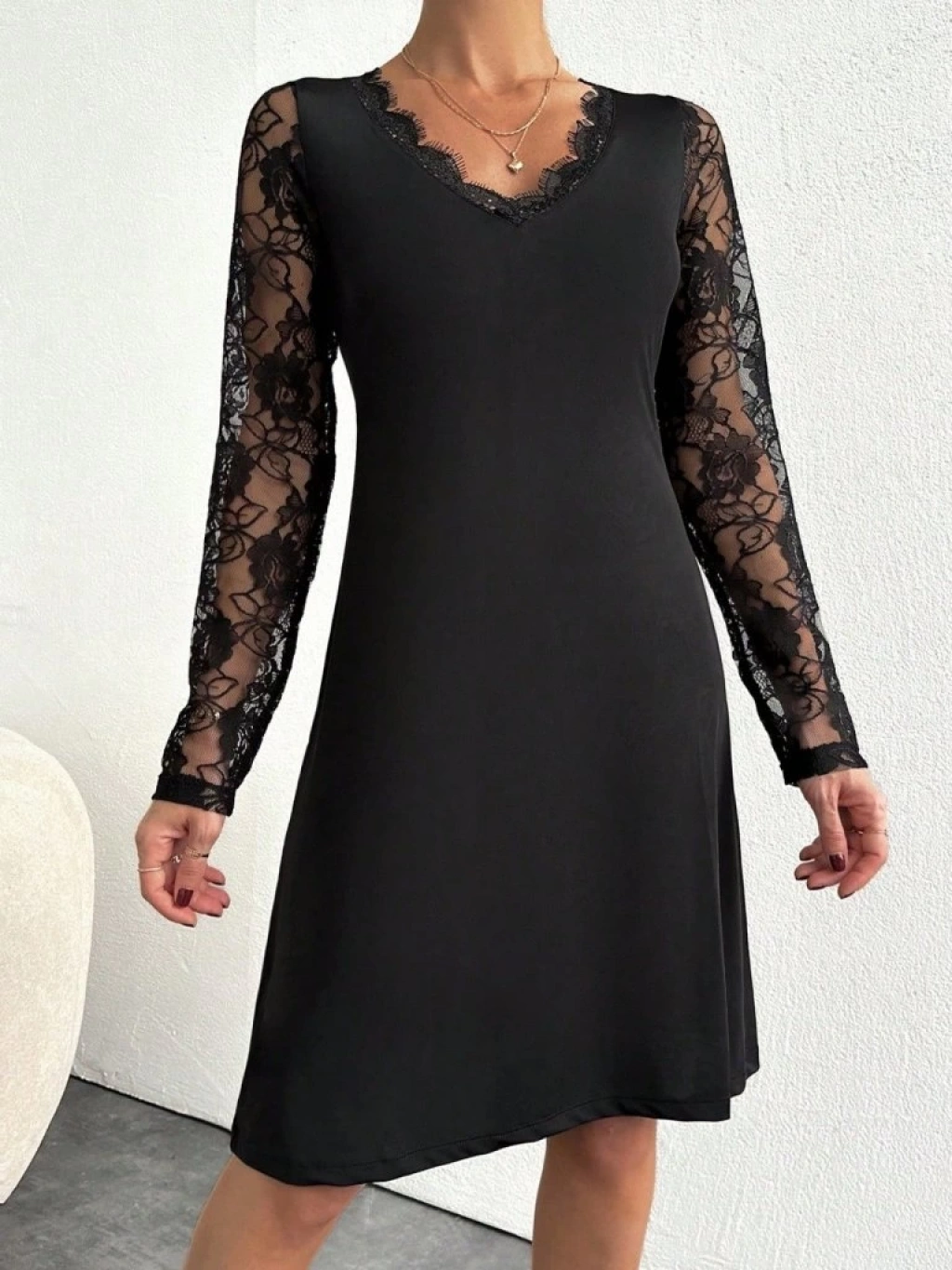 Kadın Uzun Kollu Yaka Ve Kol Dantel Detay Sandy Mini Boy Elbise