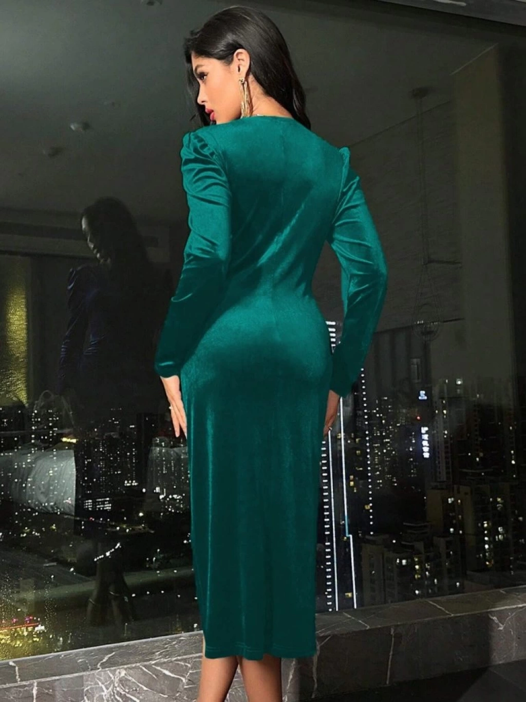 Kadın Uzun Kollu Kruvaze Yakalı Yandan Büzgülü Midi Kadife Elbise