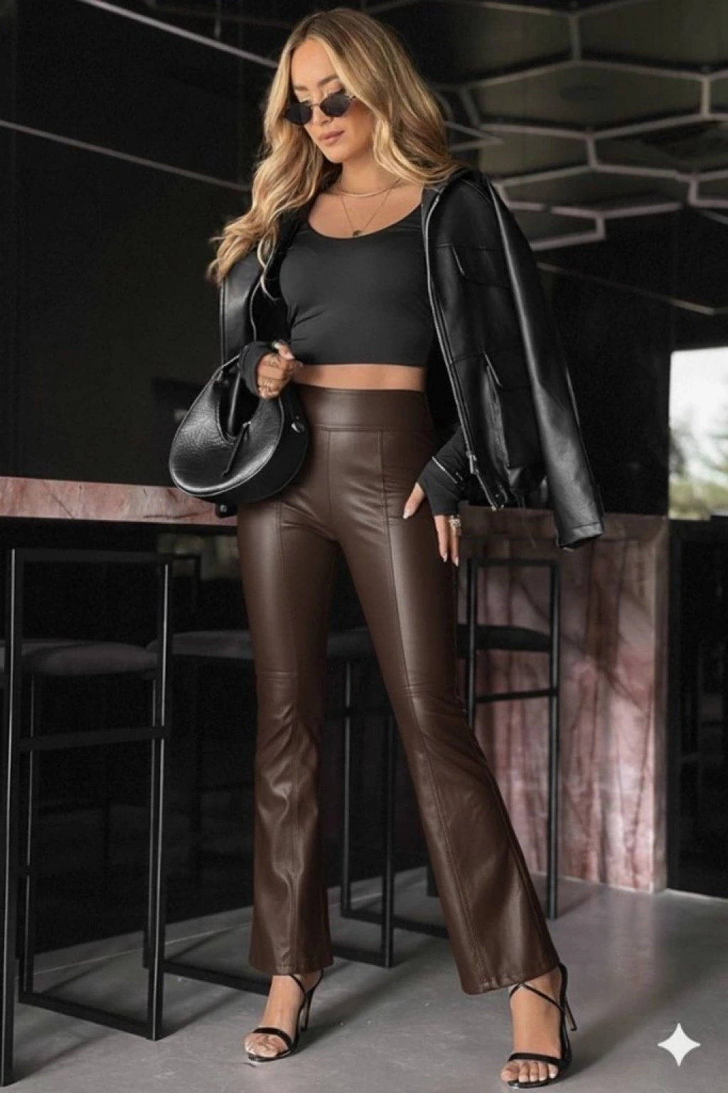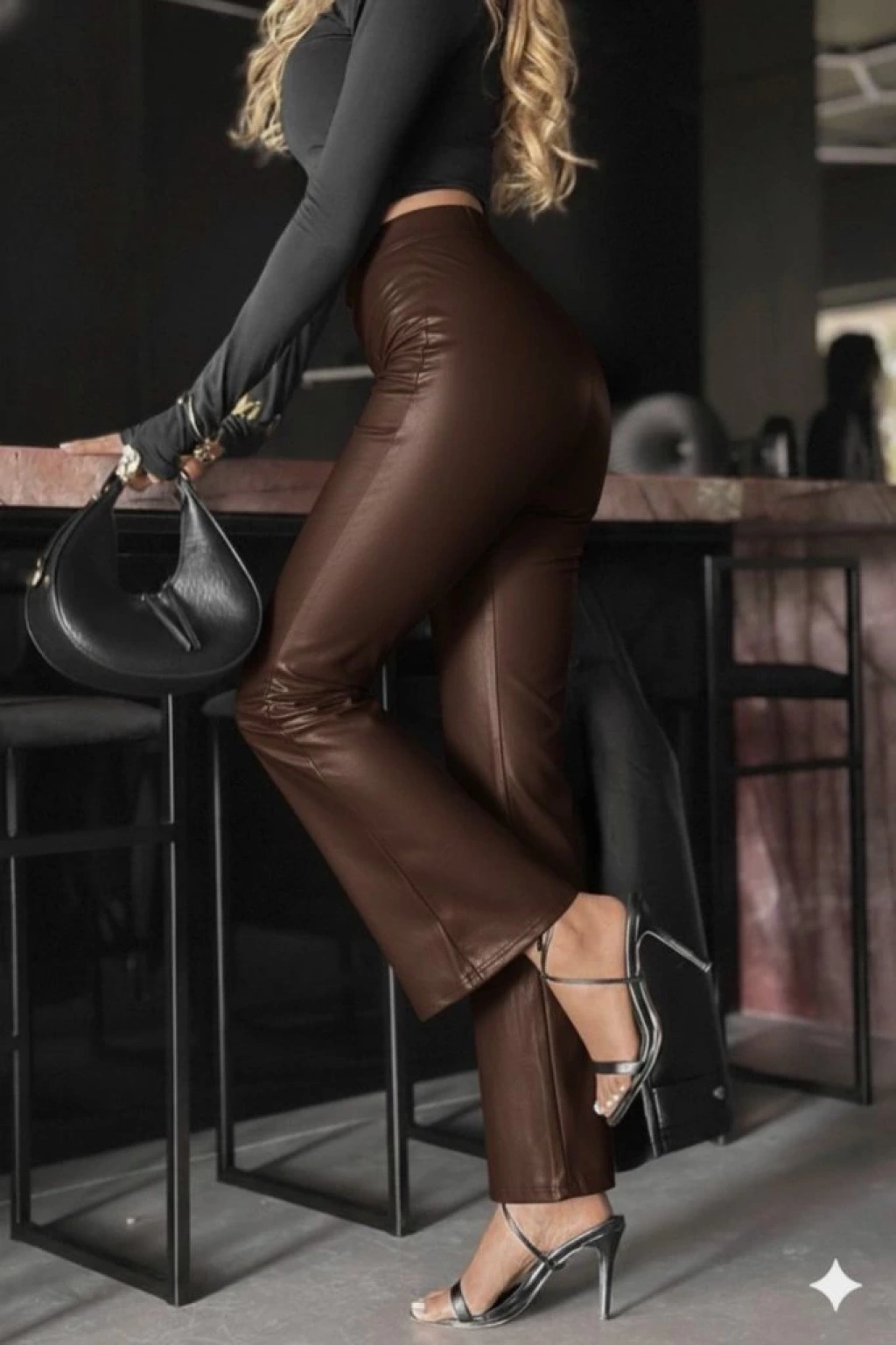 Kadın Yüksek Bel Paçaya Doğru Geniş Deri Pantolon