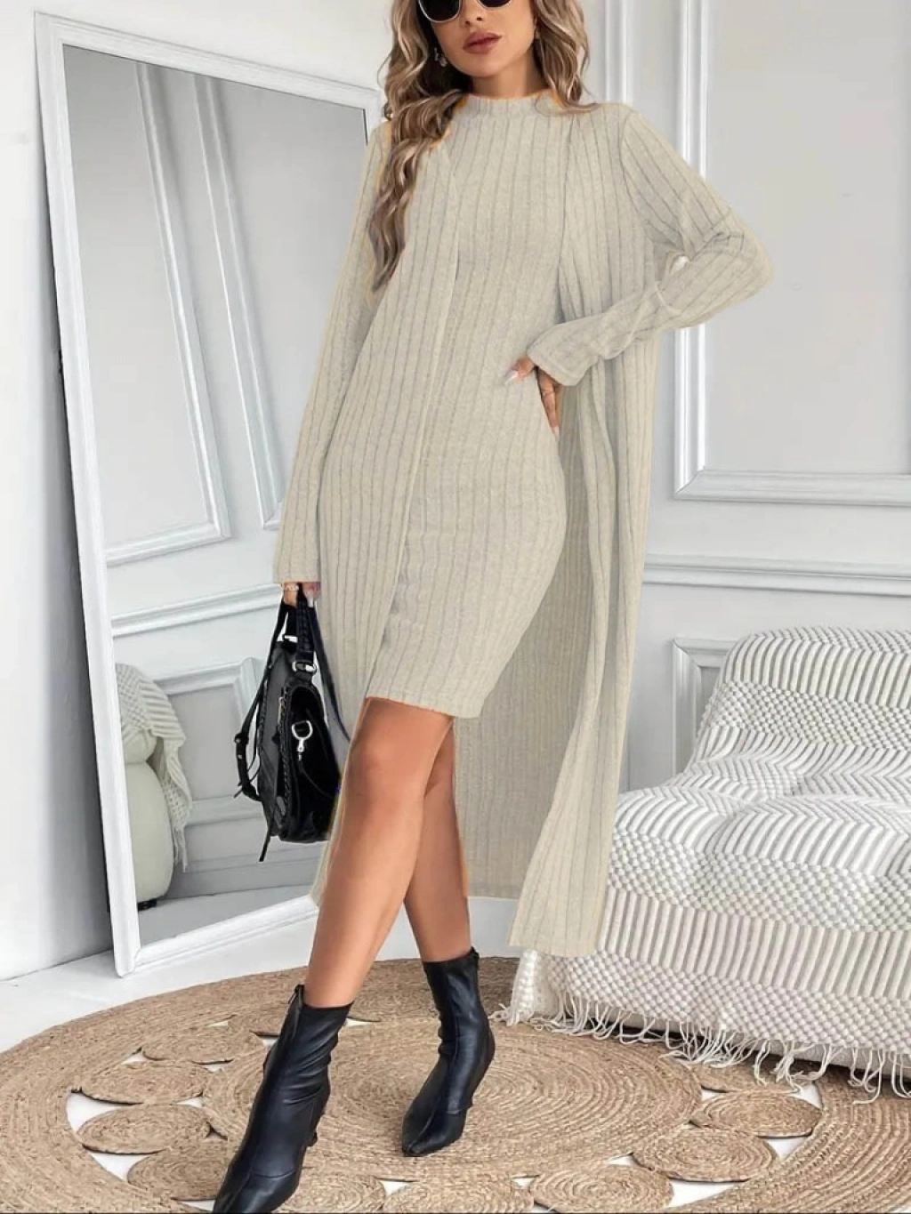 Kadın Askılı Balıkçı Yaka Kısa şardonlu Kaşkorse Elbise Ve Uzun Kollu Ceket Ikili Takım