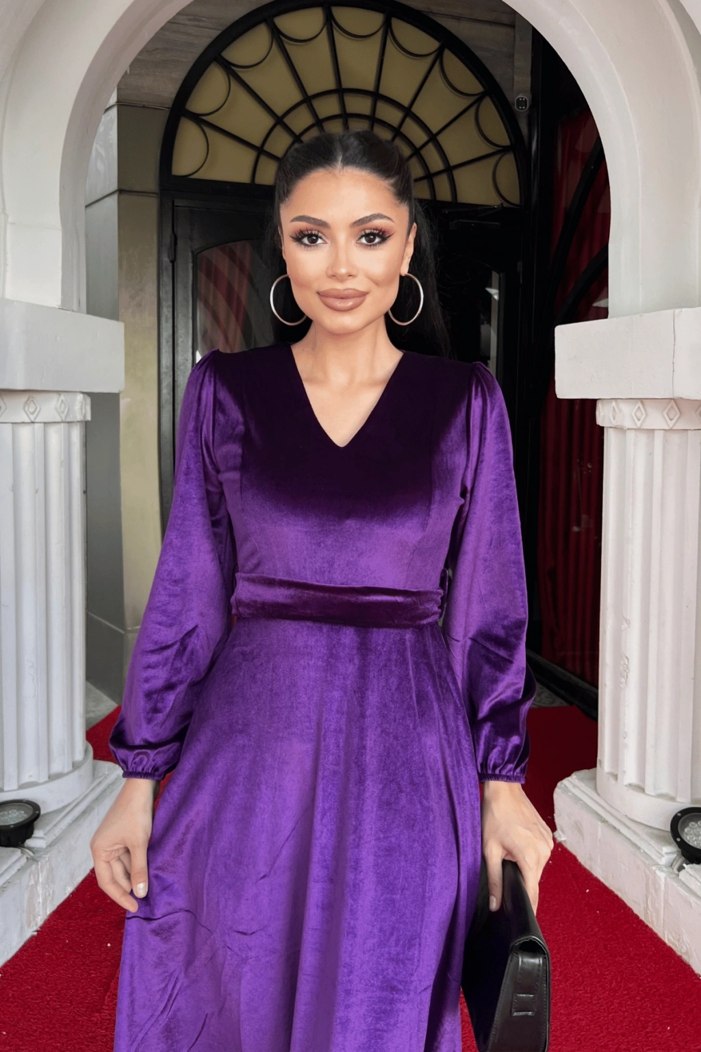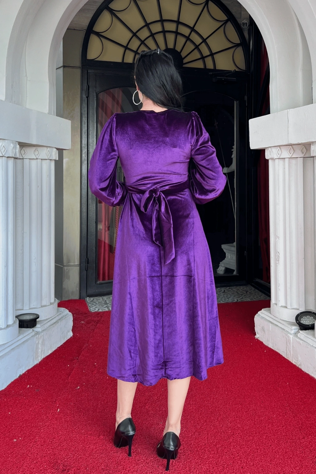 Kadın Uzun Kollu V Yaka Kuşak Dahil Kadife Kumaş Midi Boy Elbise