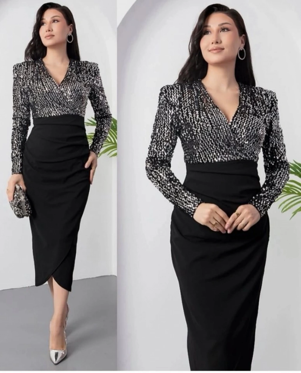 Kadın Uzun Kpllu Kruvaze Yaka Pul Pyaet Detay Midi Elbise