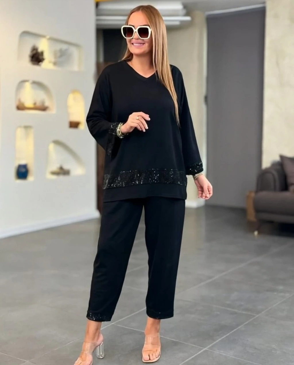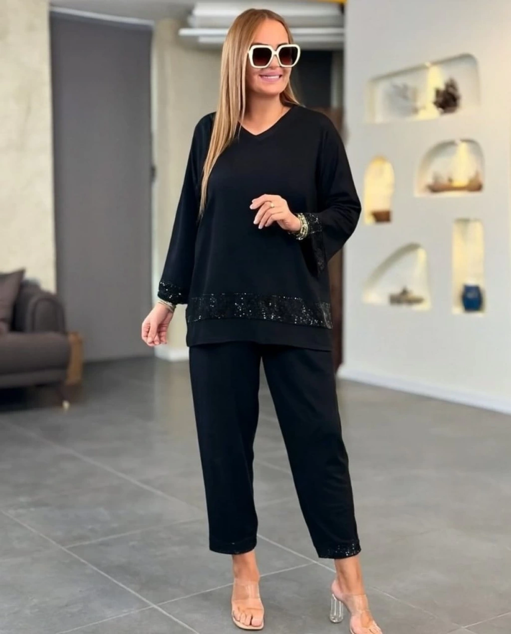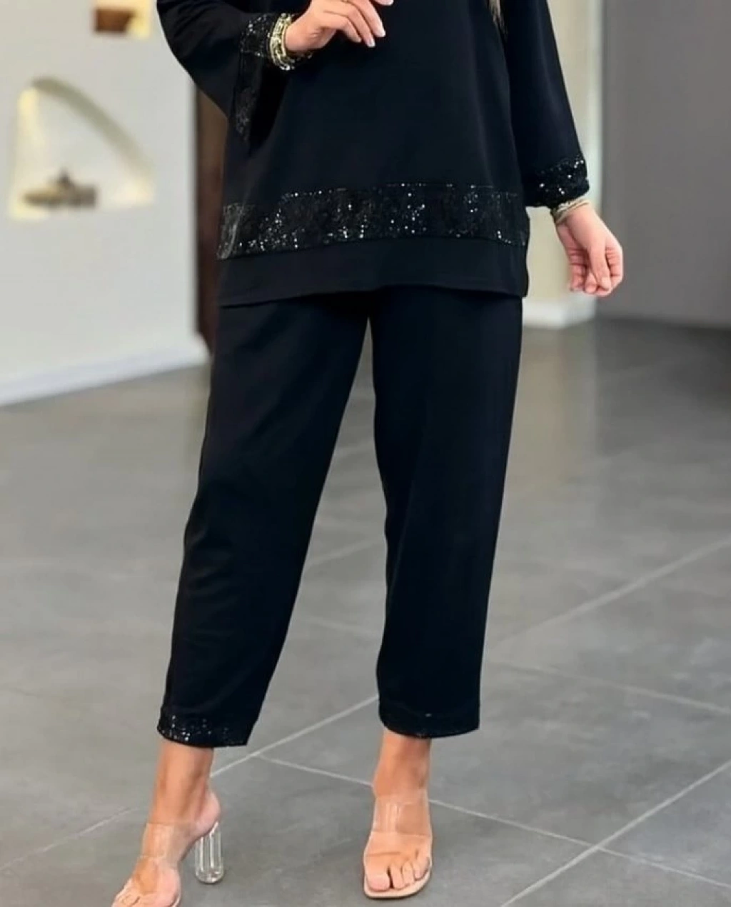Kadın Uzun Kollu V Yakalı Pulpayet Viskon Iki Iplik Bluz Ve Pantolon Takım