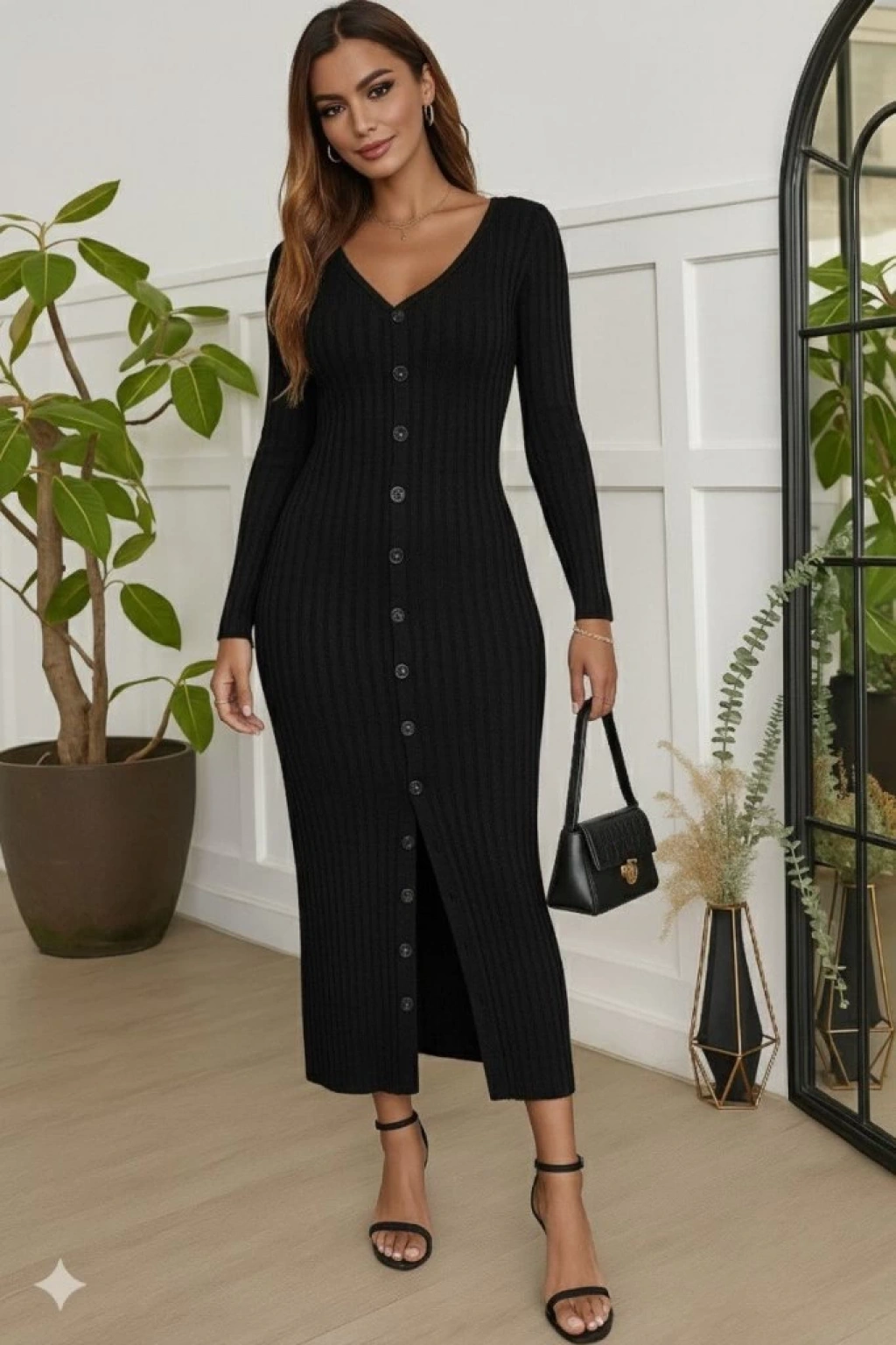 Kadın Uzun Kollu V Yakalı önden Düğmeli şardonlu Kaşkorse Elbise