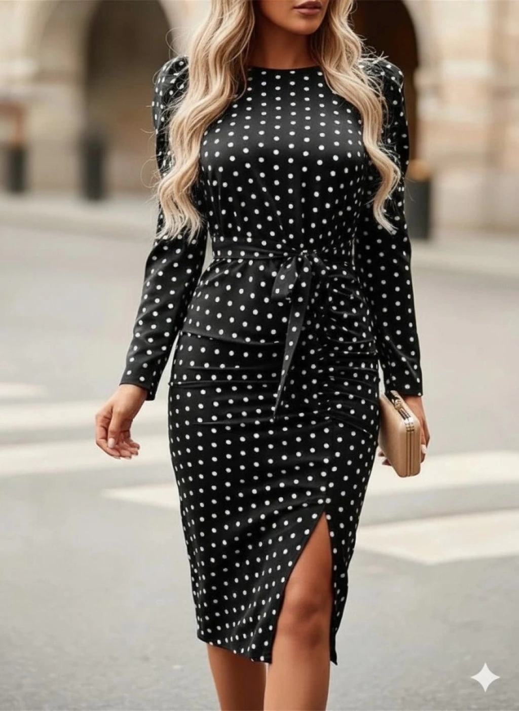 Kadın Uzun Kollu Yuvarlak Yaka Belden Kuşaklı önden Yırtmaçlı örme Krep Elbise
