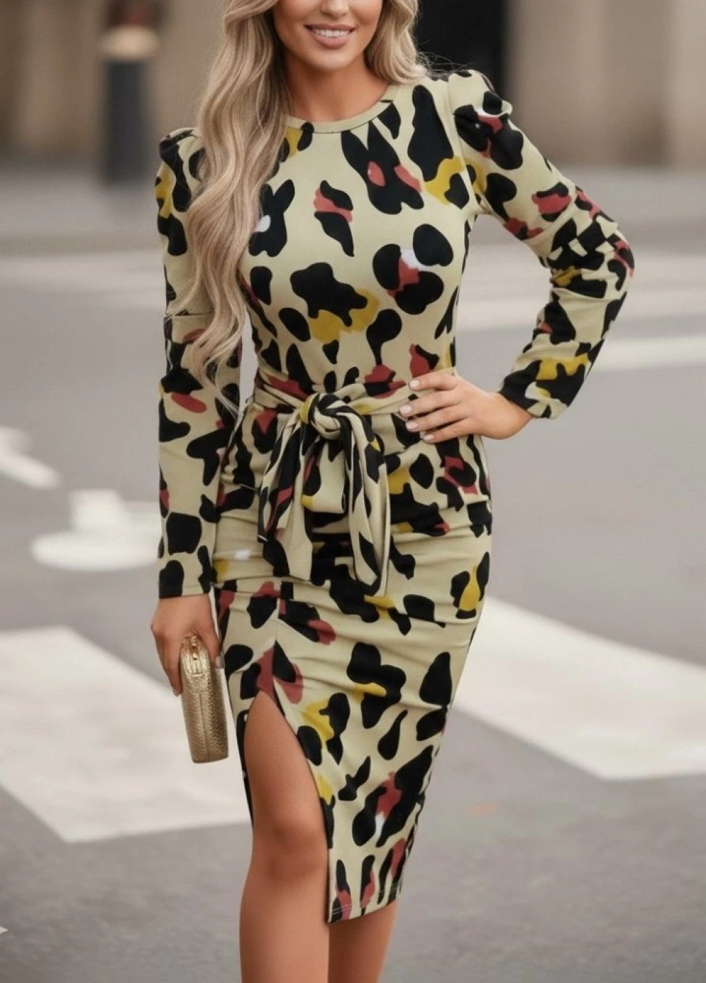 Kadın Uzun Kollu Yuvarlak Yaka Belden Kuşaklı önden Yırtmaçlı örme Krep Elbise