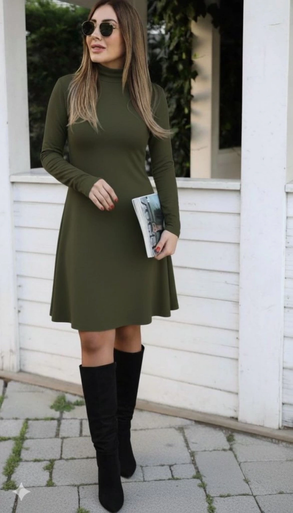 Kadın Uzun Kollu Balıkçı Yaka Salaş Mini Akrilik Elbise