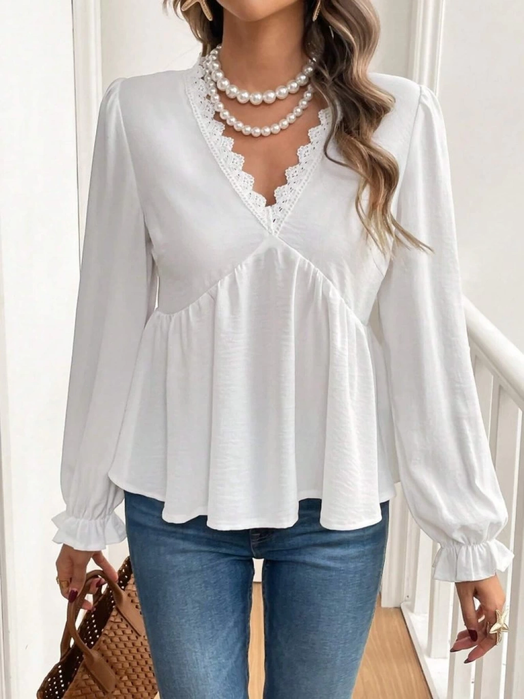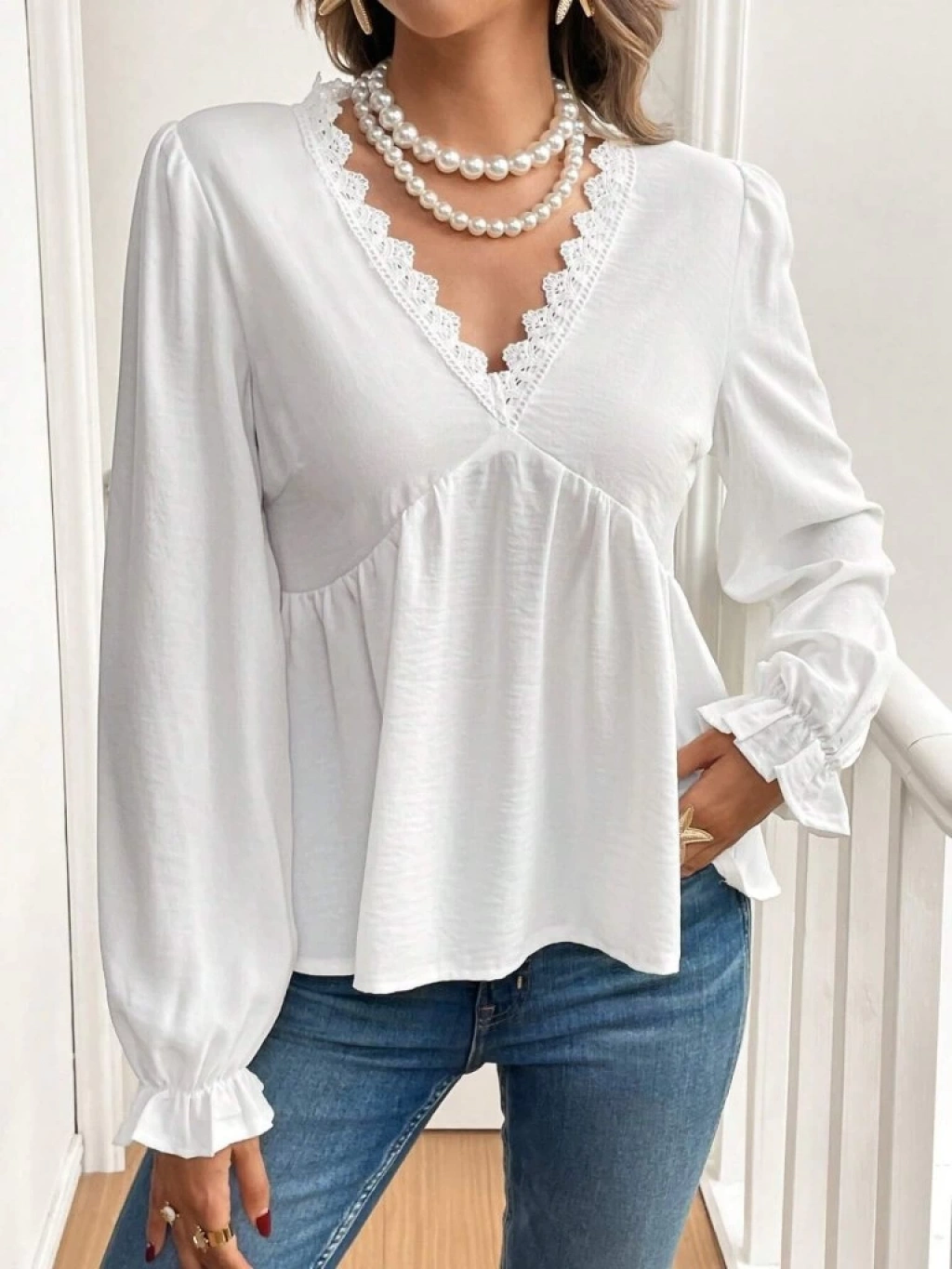 Kadın Uzun Kollu V Dantel Yaka Aerobin Bluz