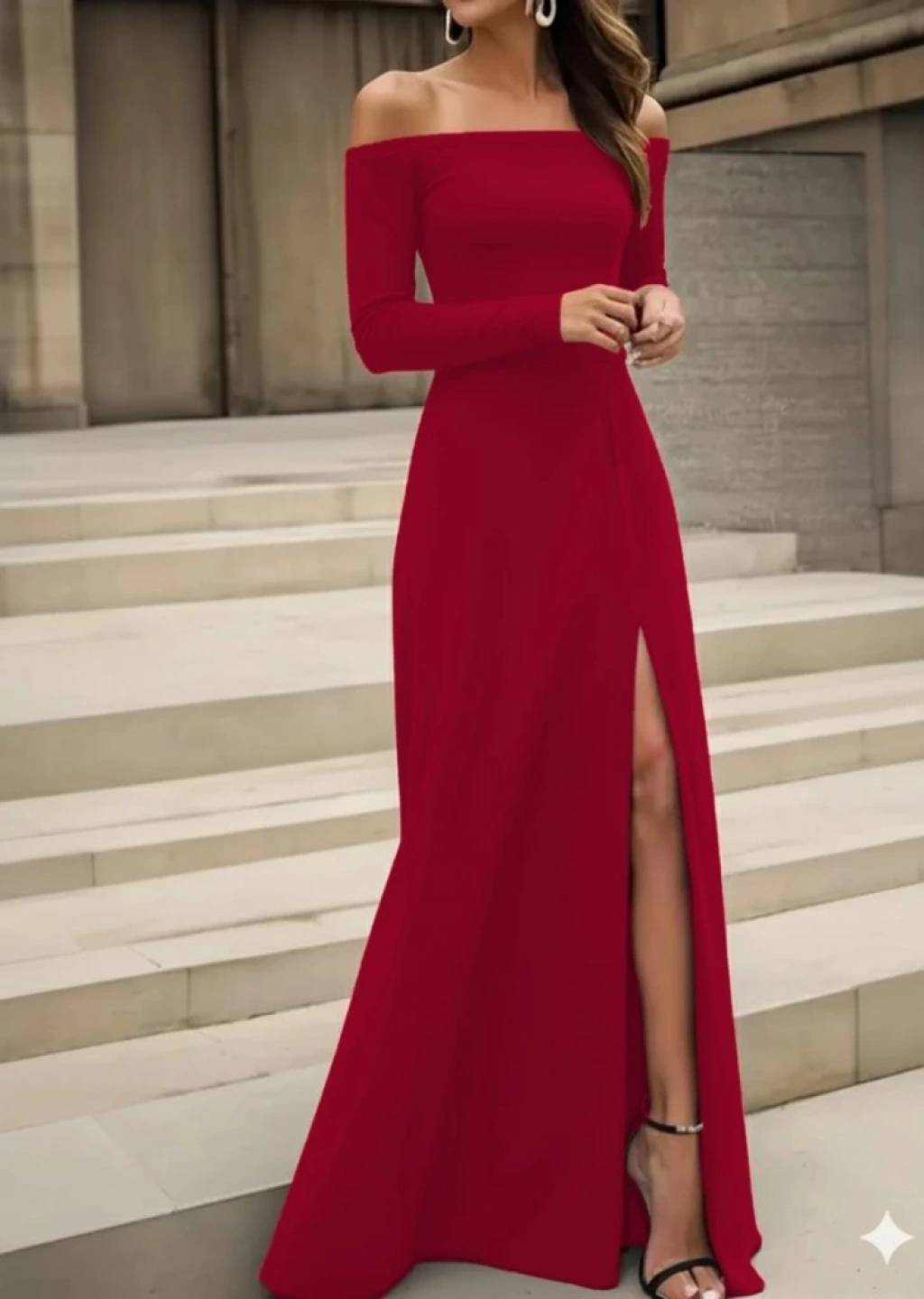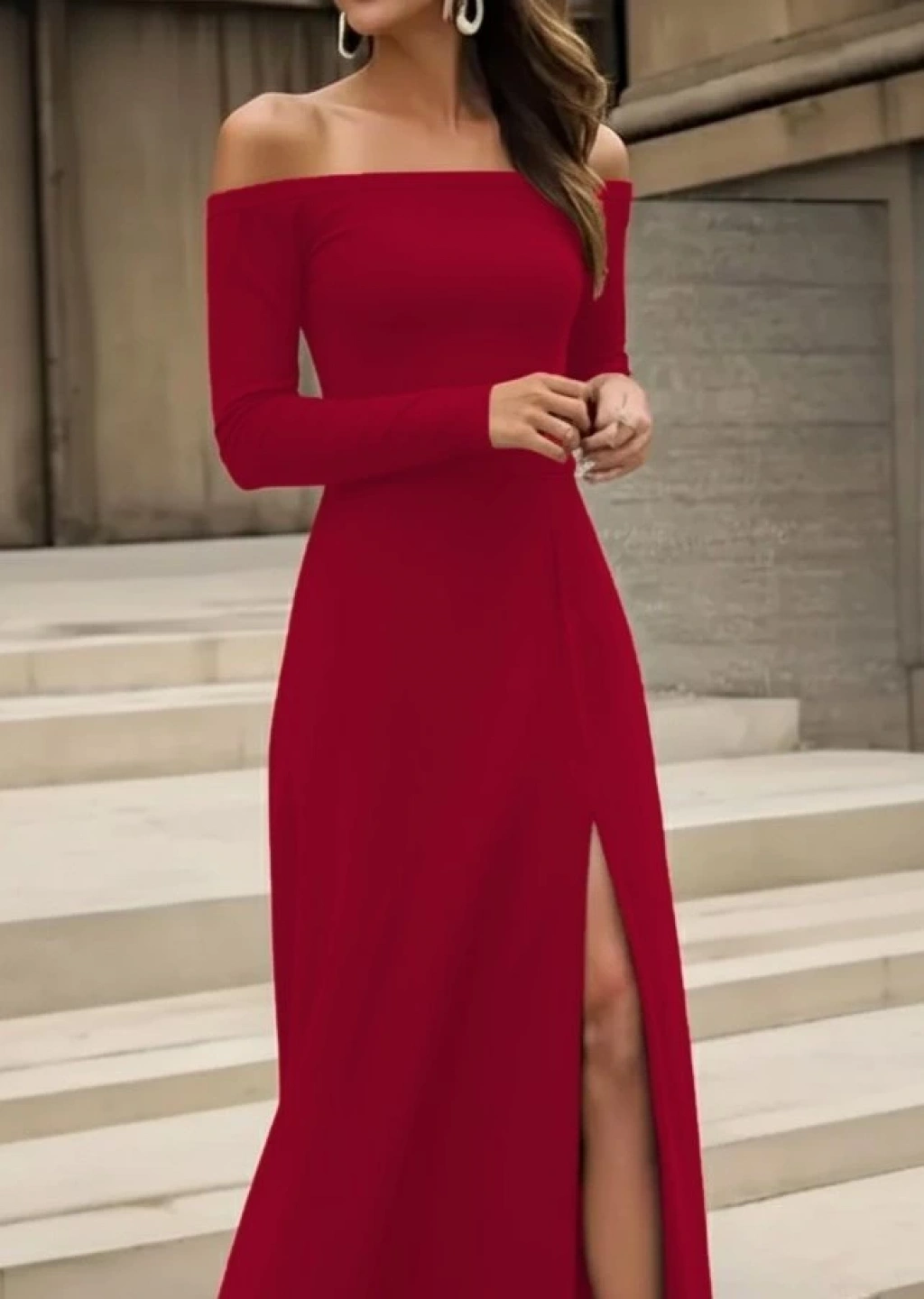 Kadın Uzun Kollu Madonna Yakalı Yırtmaç Detaylı Uzun Ithal Krep Elbise