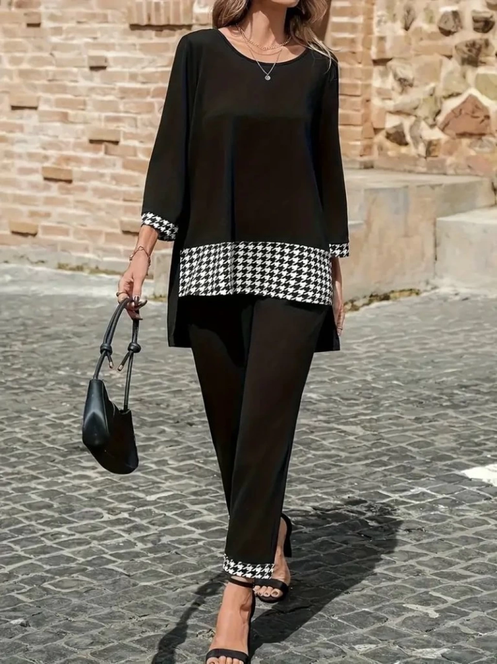 Kadın Uzun Kollu Yuvarlak Yakalı Kaz Ayağı Detaylı Viskon Iki Iplik Bluz Ve Pantolon Ikili Takım